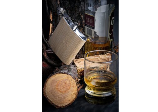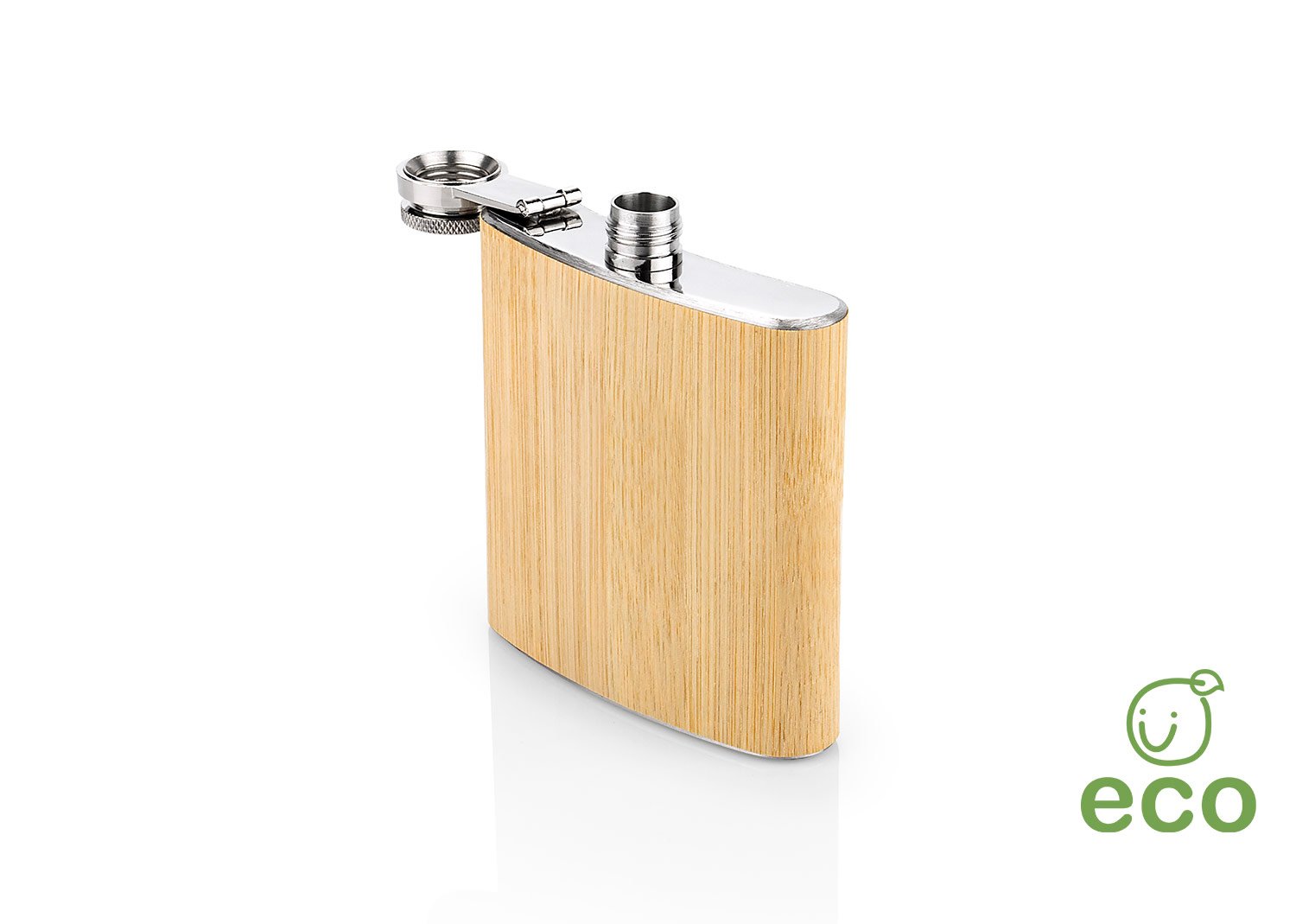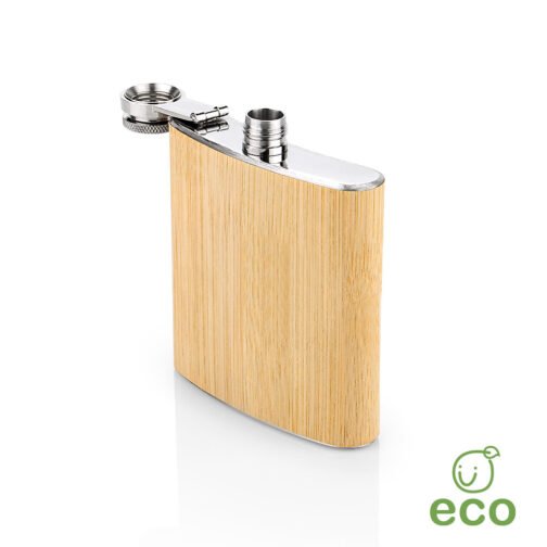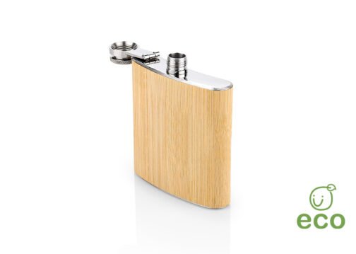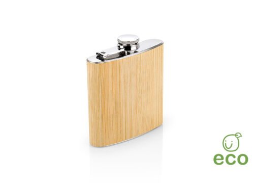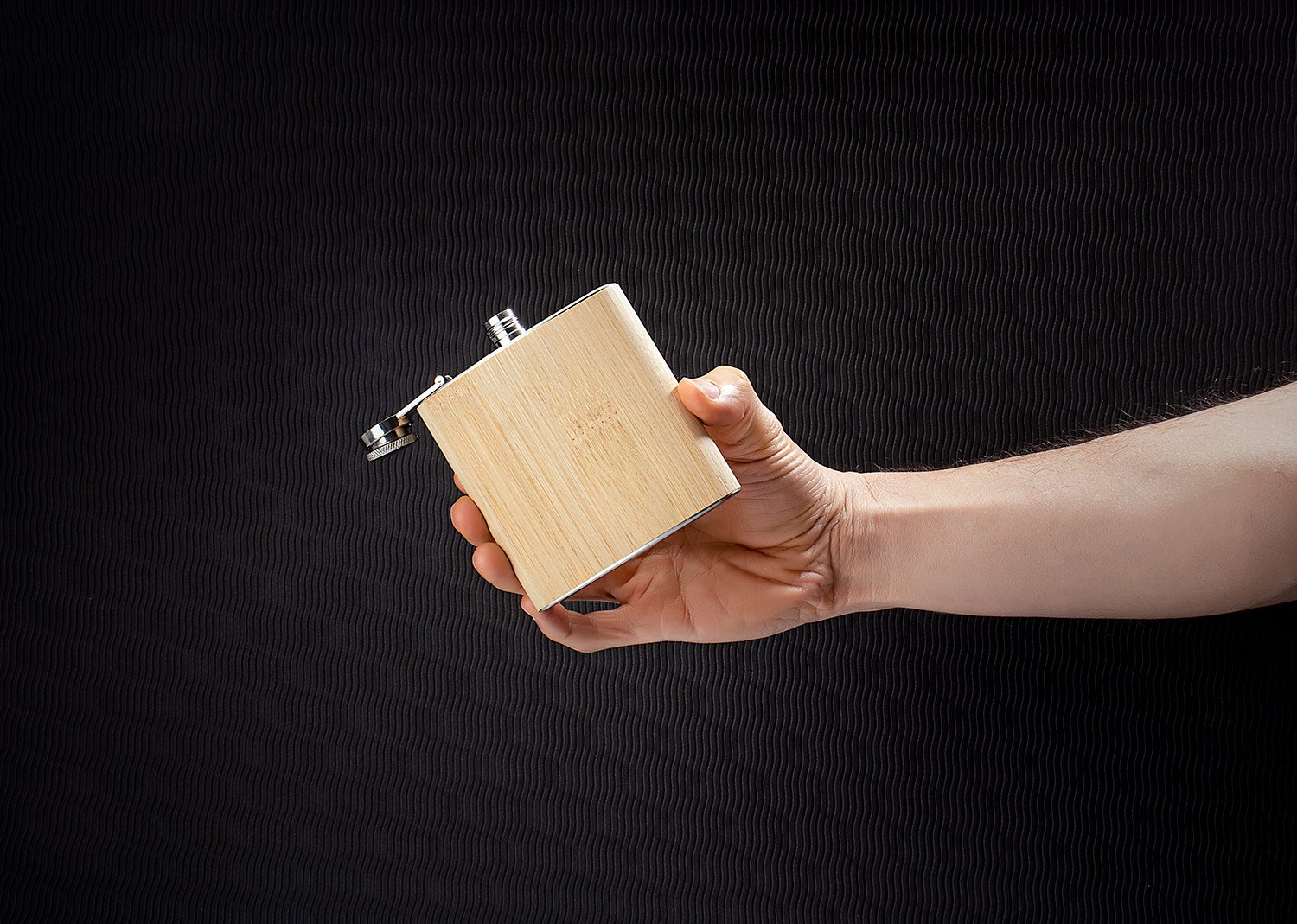 Mini licorera en presentación fácil llevar y tomar su bebida favorita. En acero inoxidable con acabado exterior en Bambú. Capacidad 175ml / 6 Oz.