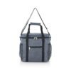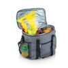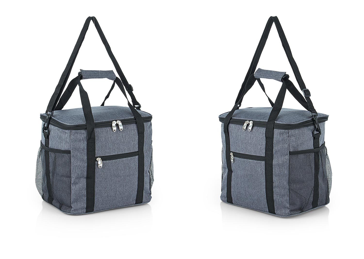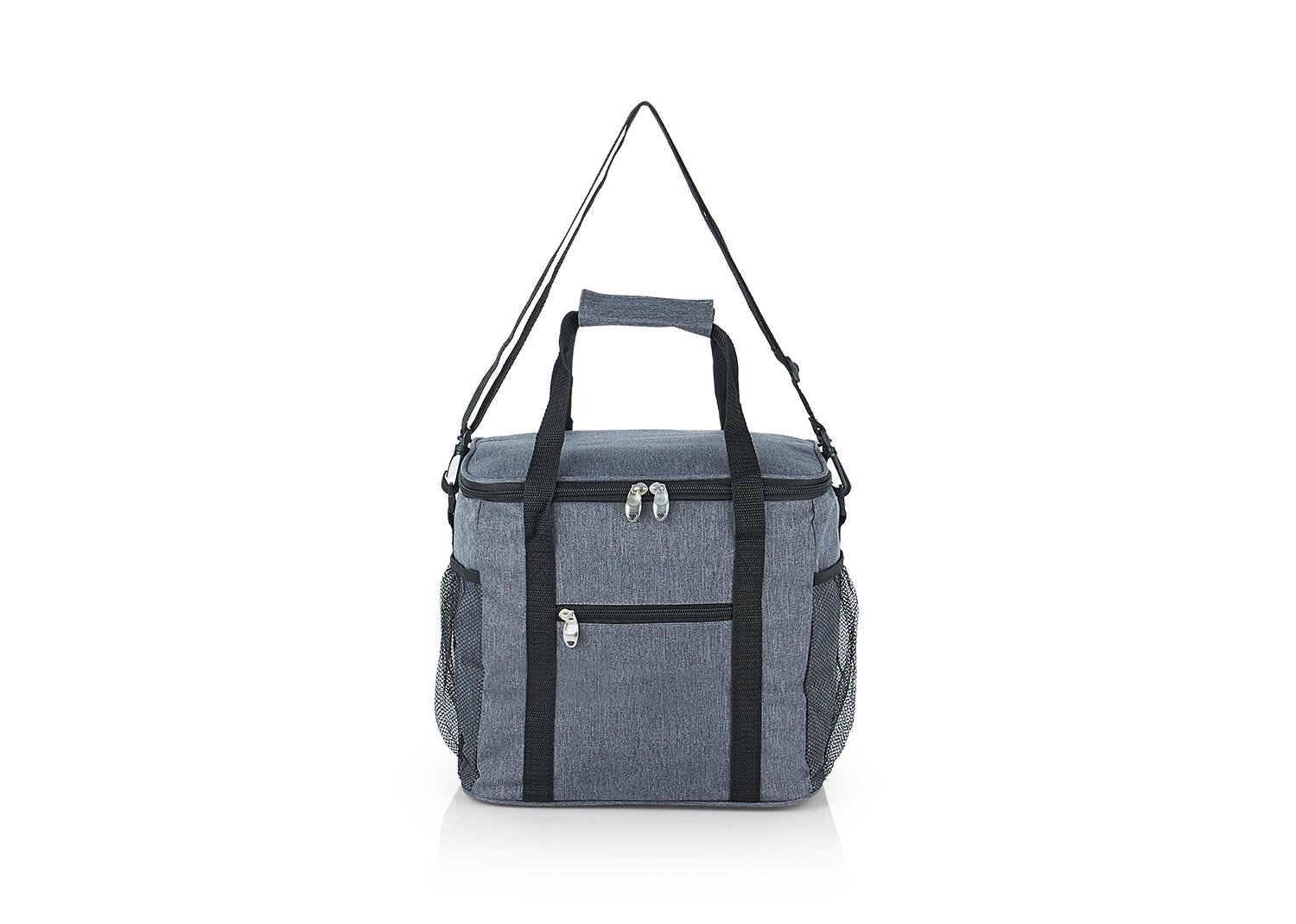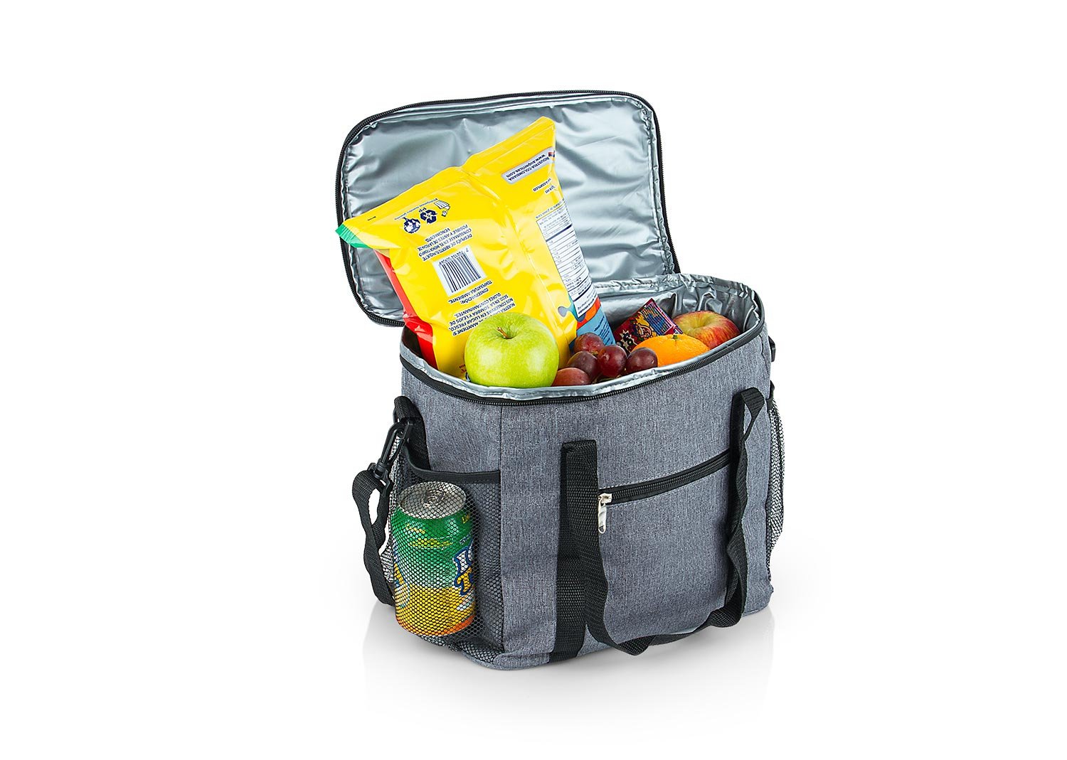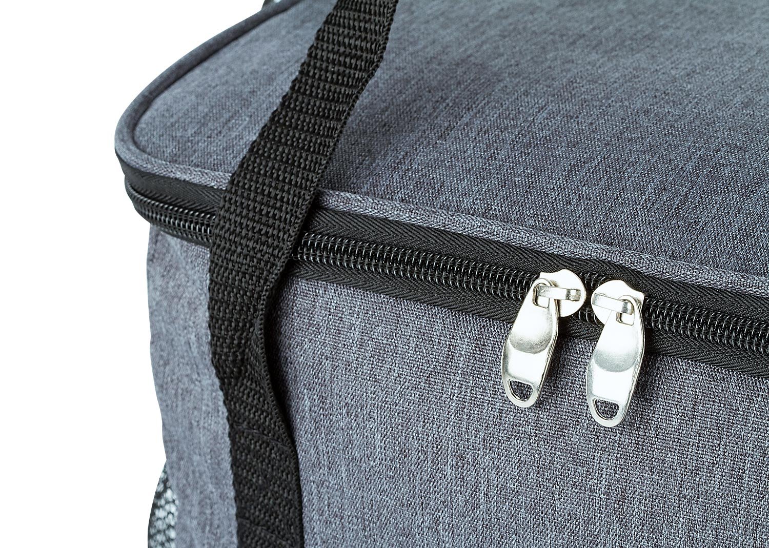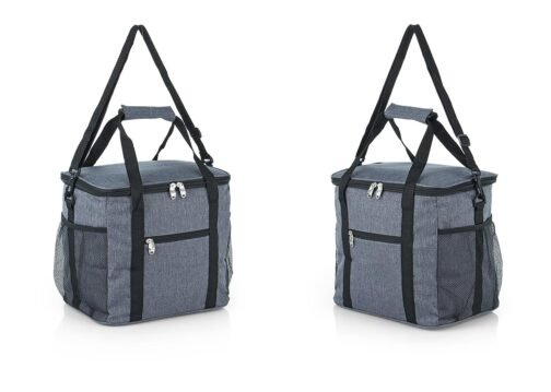 Lonchera térmica con recubrimiento interior en PEVA que conserva las bebidas o alimentos fríos por más tiempo, bolsillo principal y frontal con cierre en cremallera y bolsillos laterales en malla. Con práctica agarradera de mano y cargadera larga ajustable.