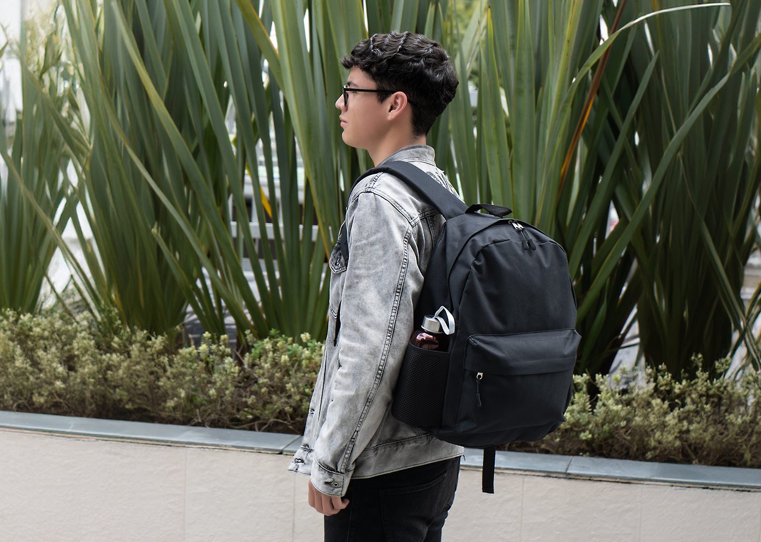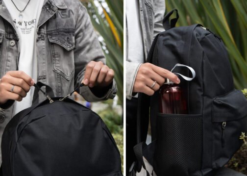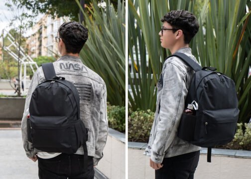 Morral para laptop con respaldo ergonómico, cómodo y ajustable. Cuenta con un bolsillo principal con cremallera y espuma en la parte trasera, así como un bolsillo frontal complementario. También tiene dos bolsillos laterales de malla ideales para botellas o cables.