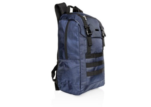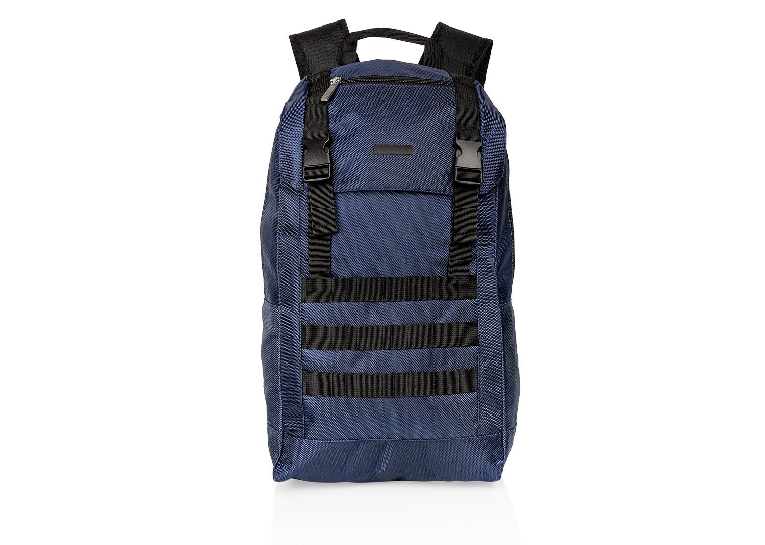 Morral para laptop con espaldar ergonómico y cargaderas ajustables y acolchadas. Cuenta con un bolsillo frontal, dos bolsillos medianos con compartimentos especiales en el interior y un bolsillo principal con un compartimento para dispositivos portátiles de 15″. Además, tiene dos bolsillos laterales de malla. Incluye una placa metálica para marca láser.