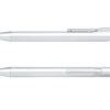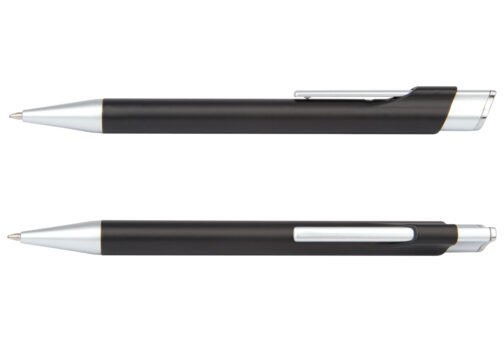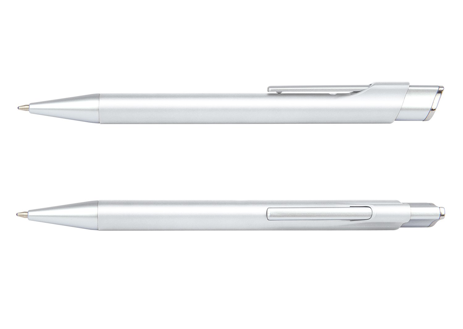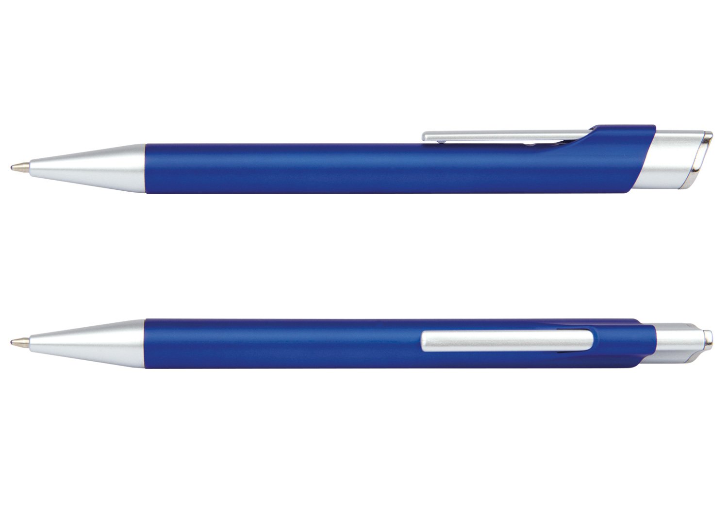 Bolígrafo plástico sistema retráctil. Clip y punta plateada.