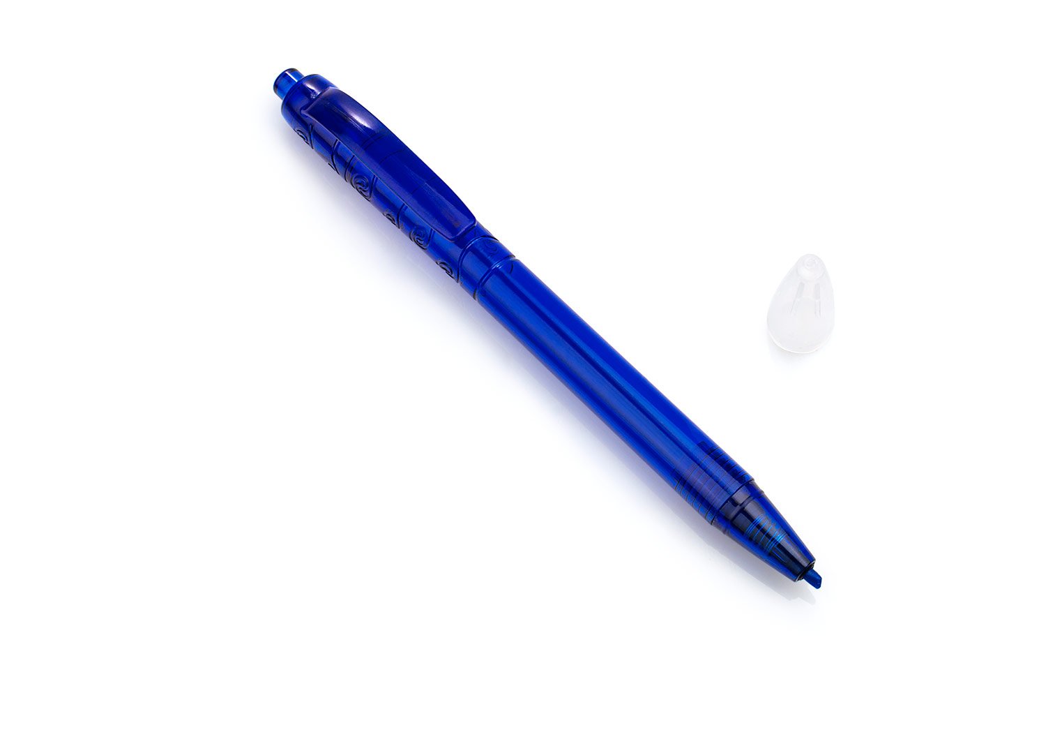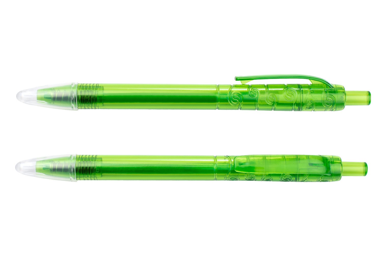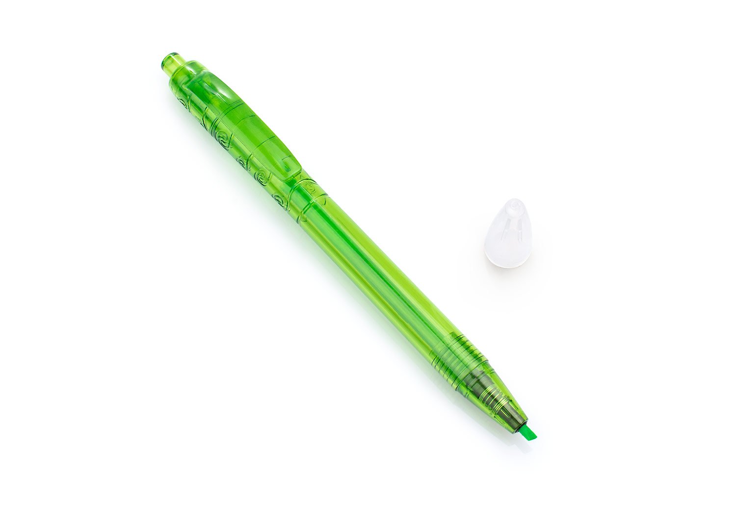 Resaltador en forma de Bolígrafo, con sistema de apertura retráctil y tapa transparente para protección, grabado en la parte superior.