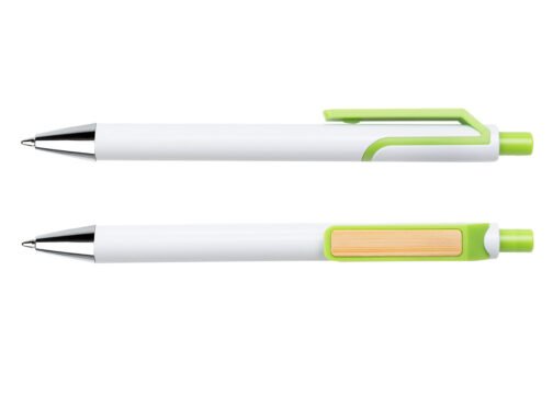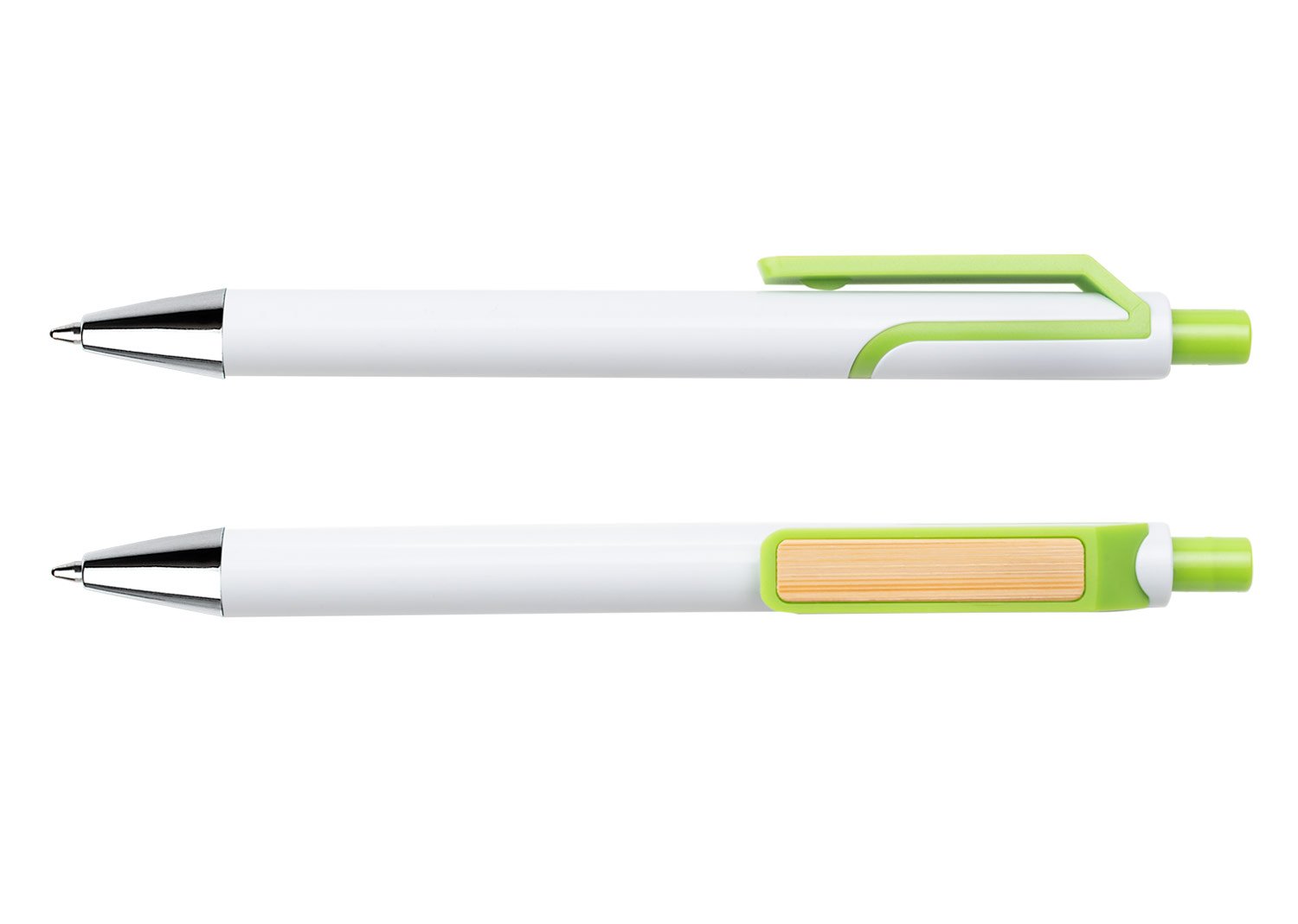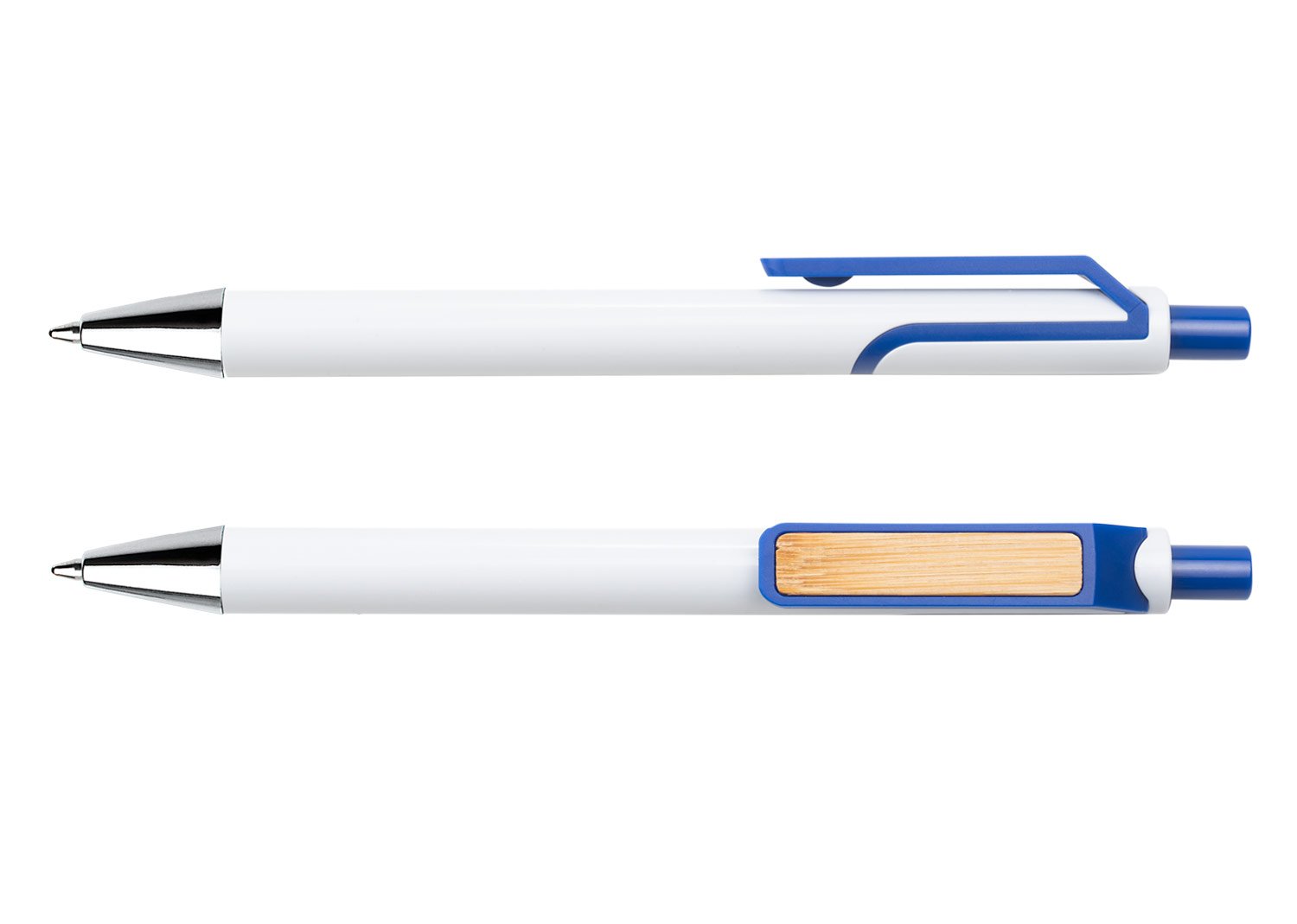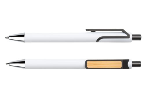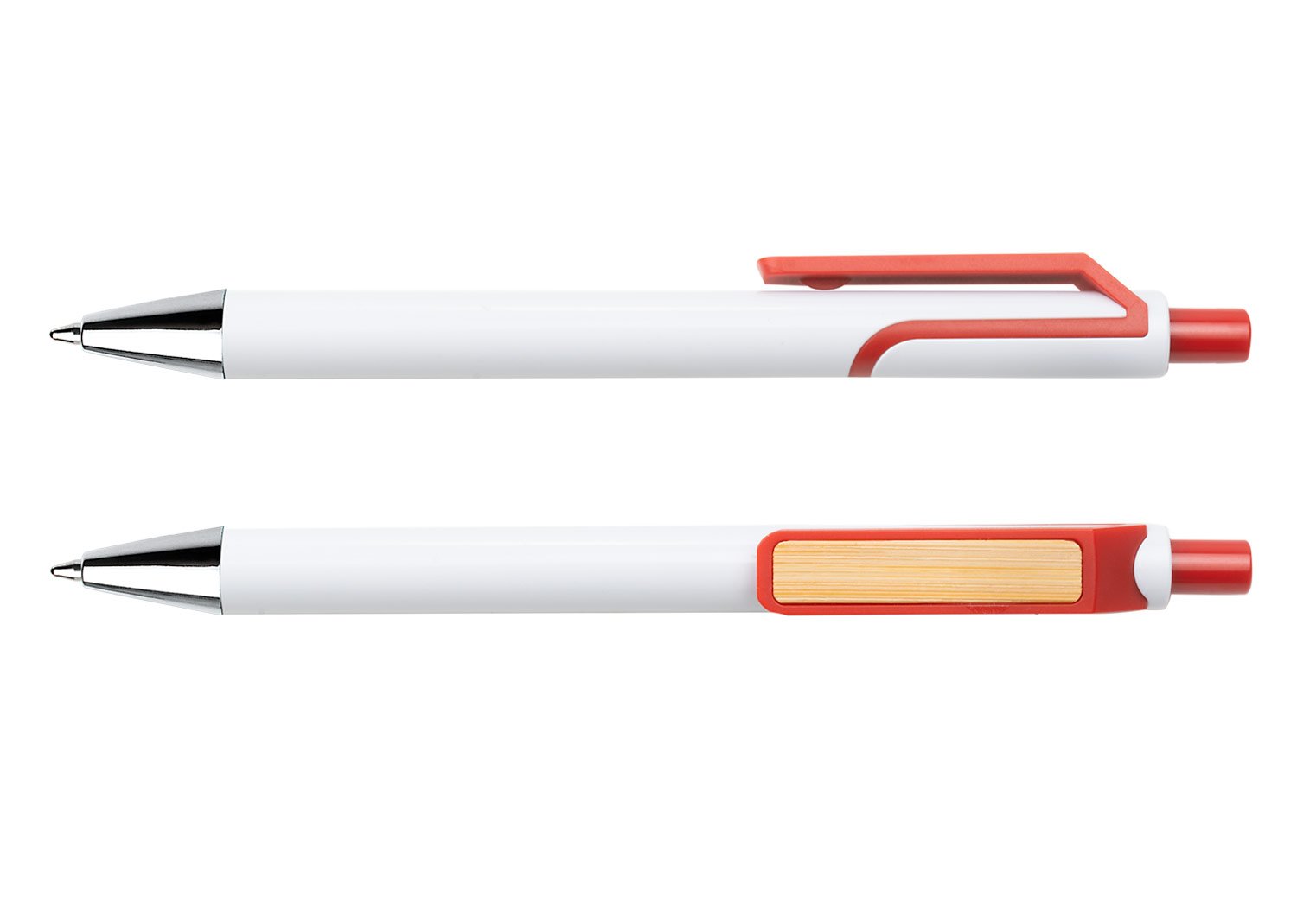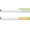 Bolígrafo de plástico con sistema retráctil y clip de bambú que puede ser usado como espacio de marca.
