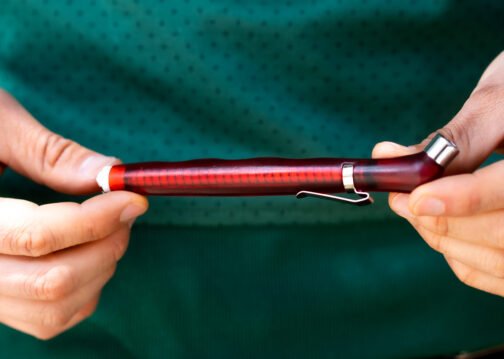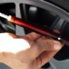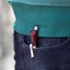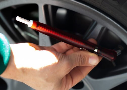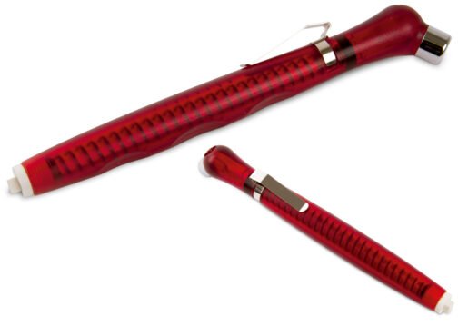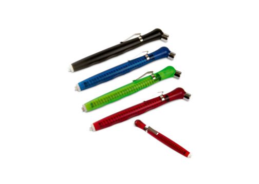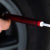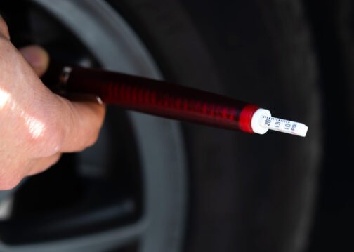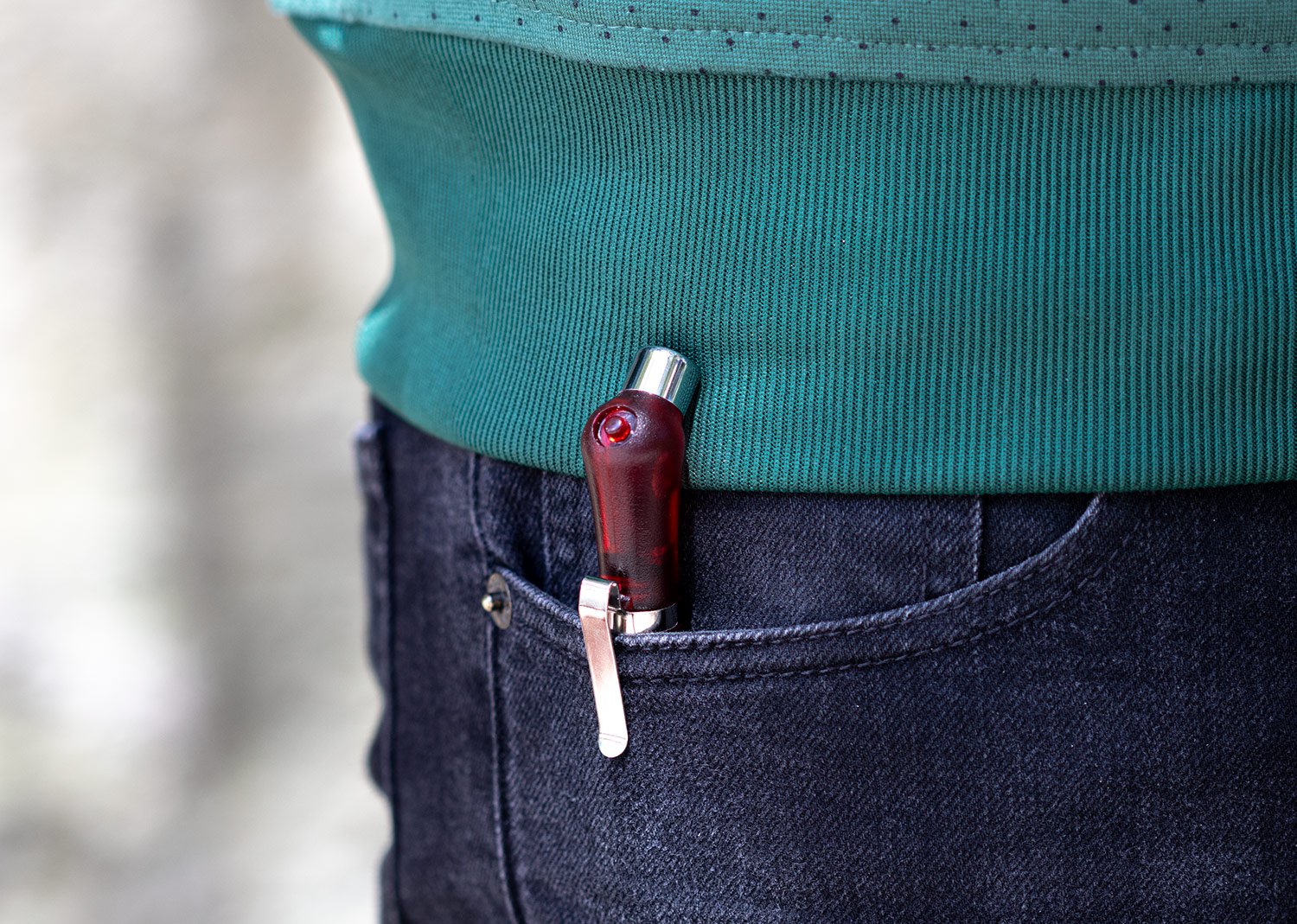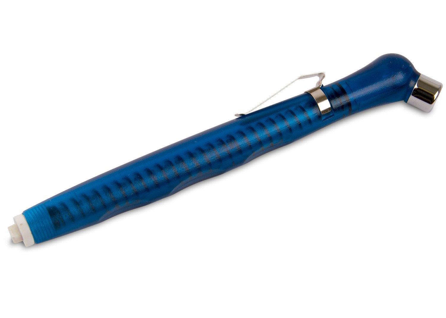 Calibrador de aire para llantas, con mango ergonómico y clip para bolsillo. Color traslúcido.