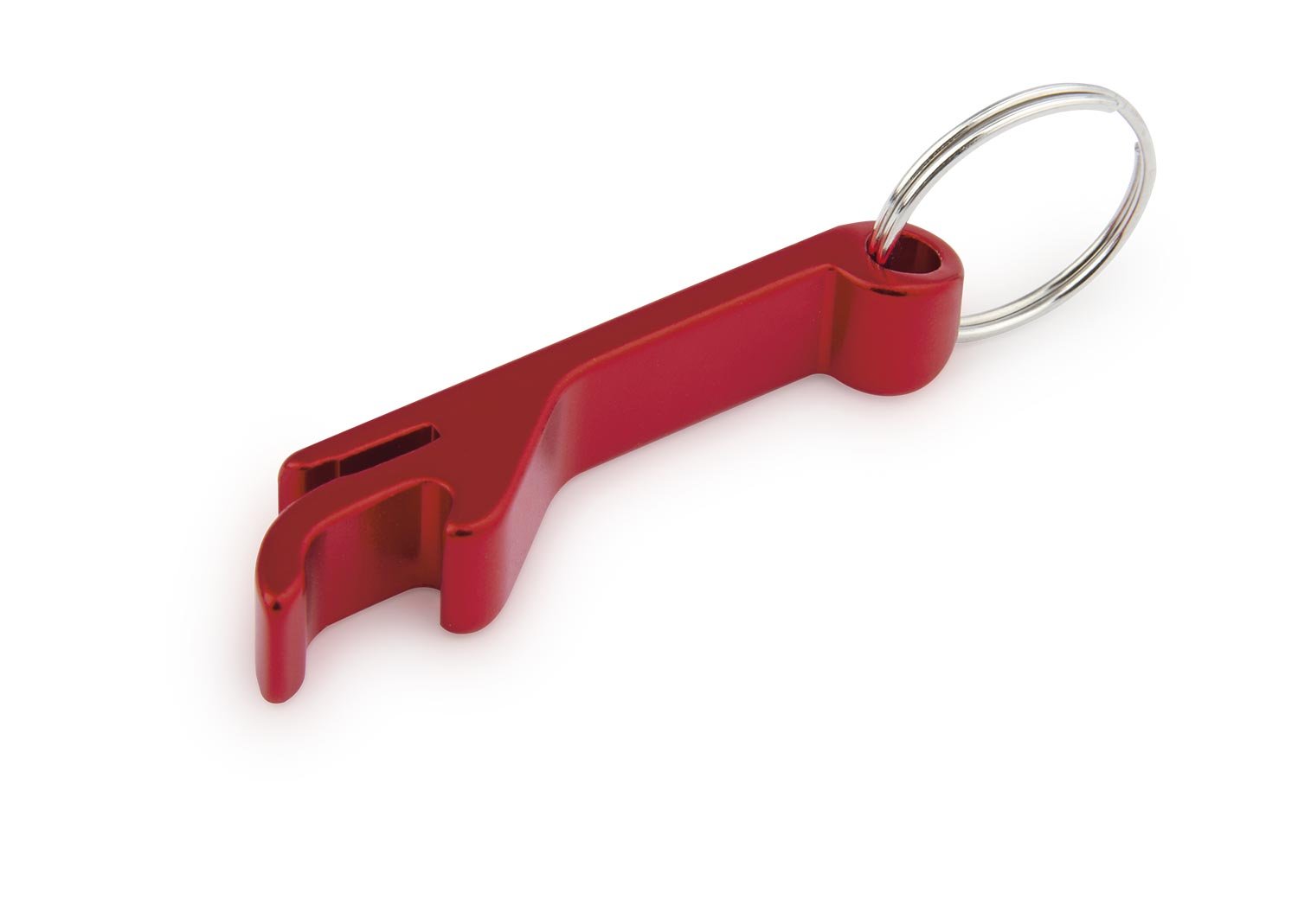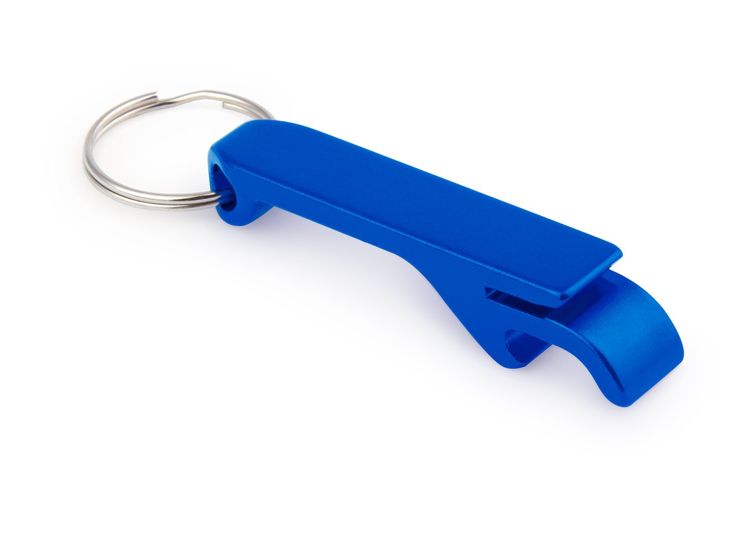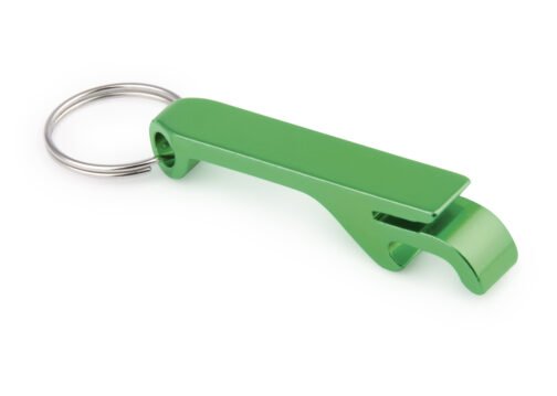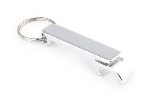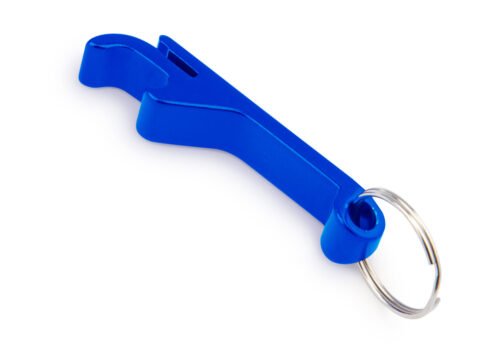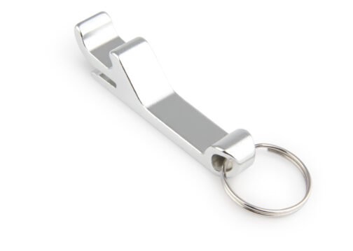 Llavero destapador en aluminio para abrir botellas y latas de gaseosa.