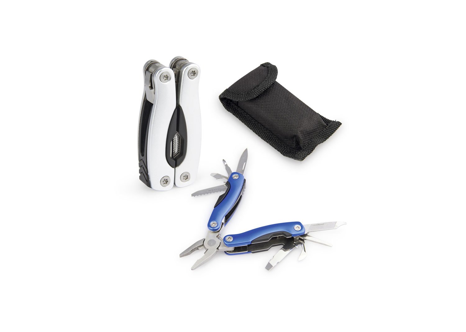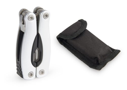 Multitool con cortafríos, destapador, 2 destornilladores planos phillips, sierra, navaja y lima. Estuche en lona con cierre en velcro.