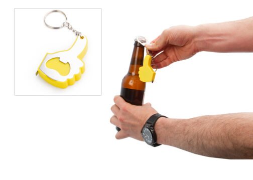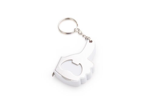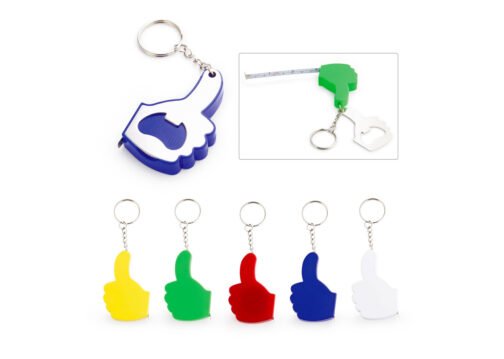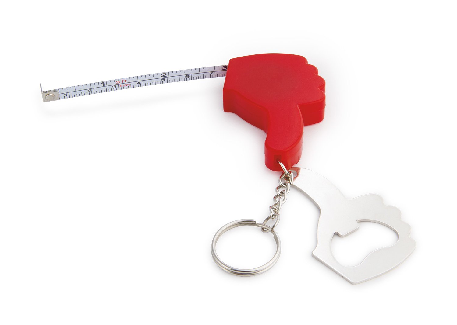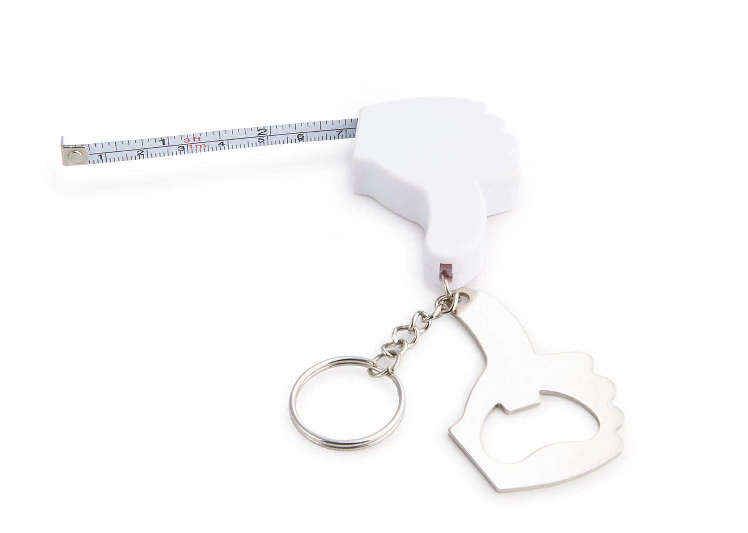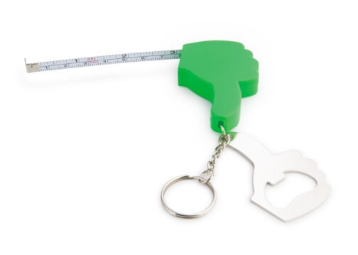 Llavero con destapador en forma de mano. Cinta métrica metálica de 1 metro/39 pulgadas.