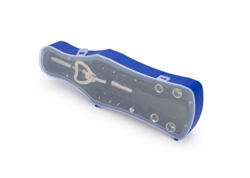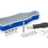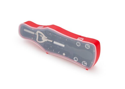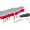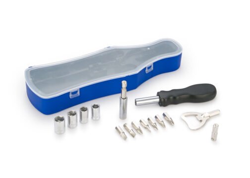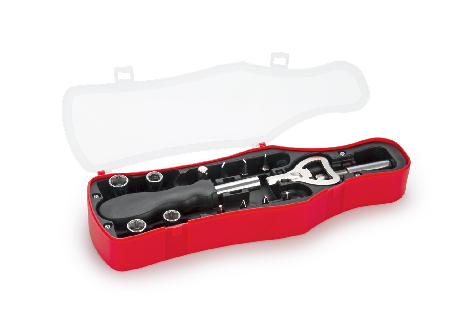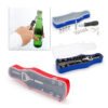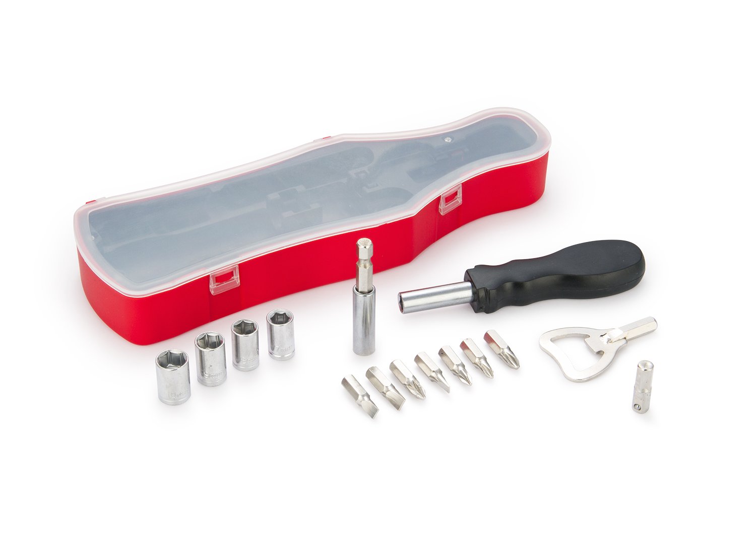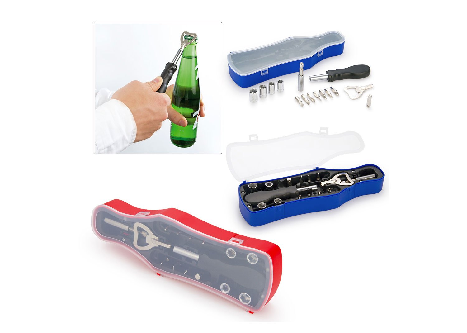 Set de herramientas de 14 piezas en forma de botella, incluye 4 copas milimétricas: Copa de 7 mm, 8 mm, 9 mm y 10 mm, 1 adaptador para copas, 7 puntas de destornilladores: 3 tipo pala, 4 tipo Phillips, 1 extensor tipo barra y un destapador de botellas.