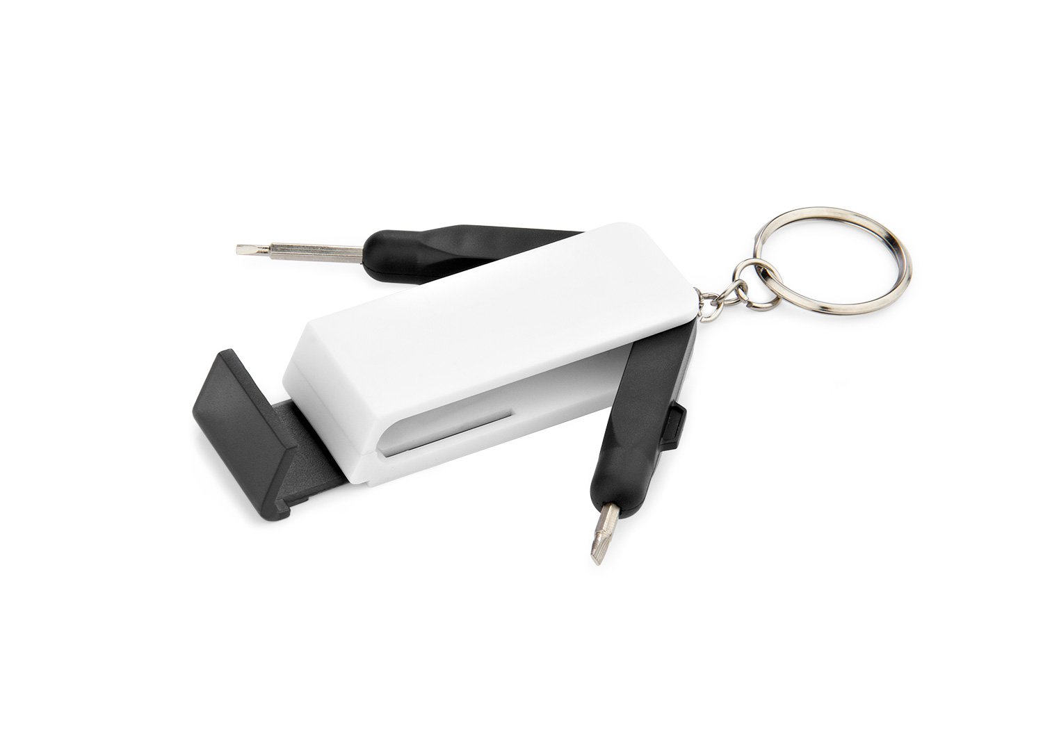 Llavero con funcion de holder para el celular y dos puntas de destornillador tipo Phillips.