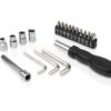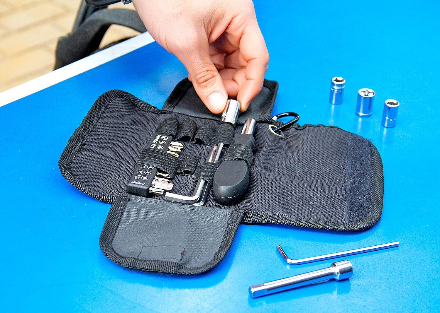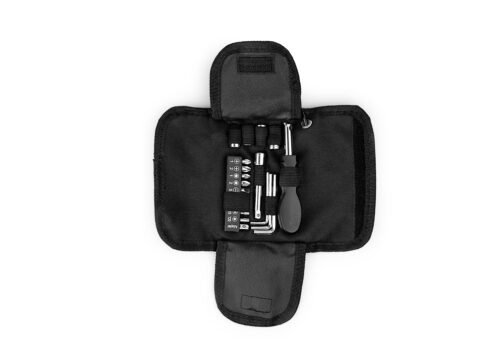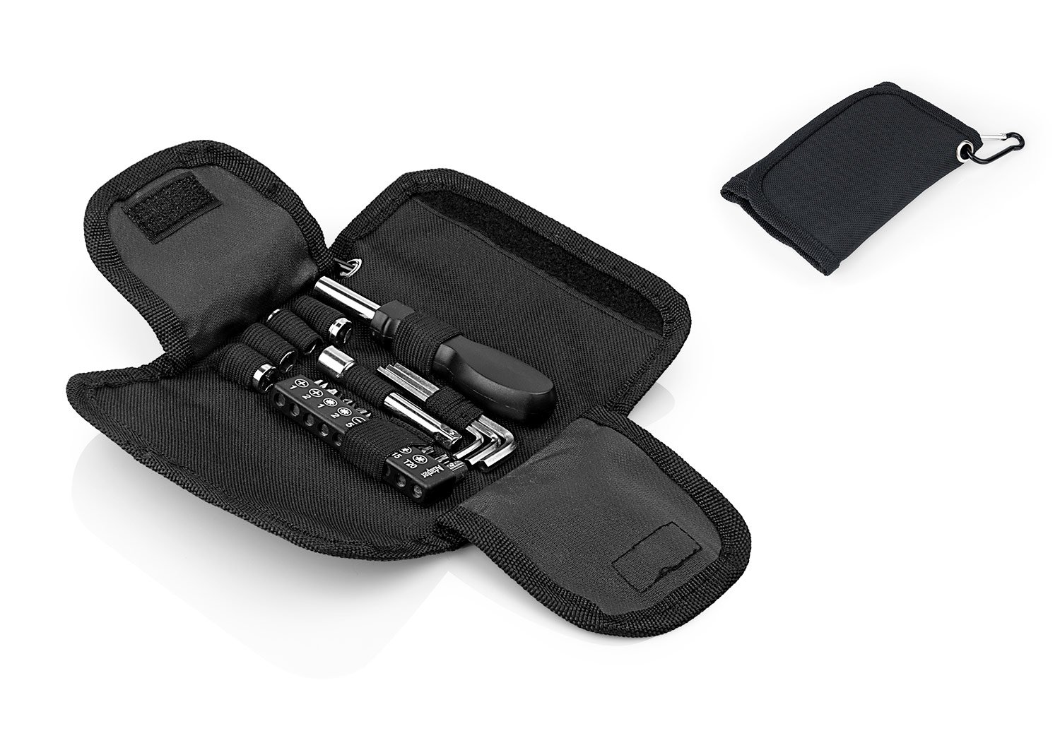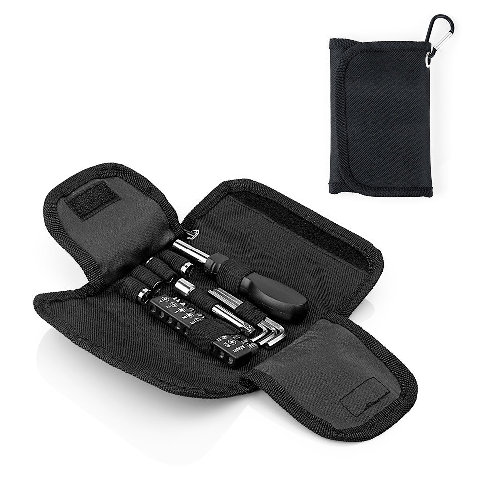 Set de herramientas presentado en estuche textil tipo sobre con cierres en velcro, carabinero y sujetadores elasticos al interior; incluye: Mango con adaptador, 9 puntas, 1 adaptador para copas, 1 extensor, 4 copas y 3 llaves hexagonales.