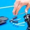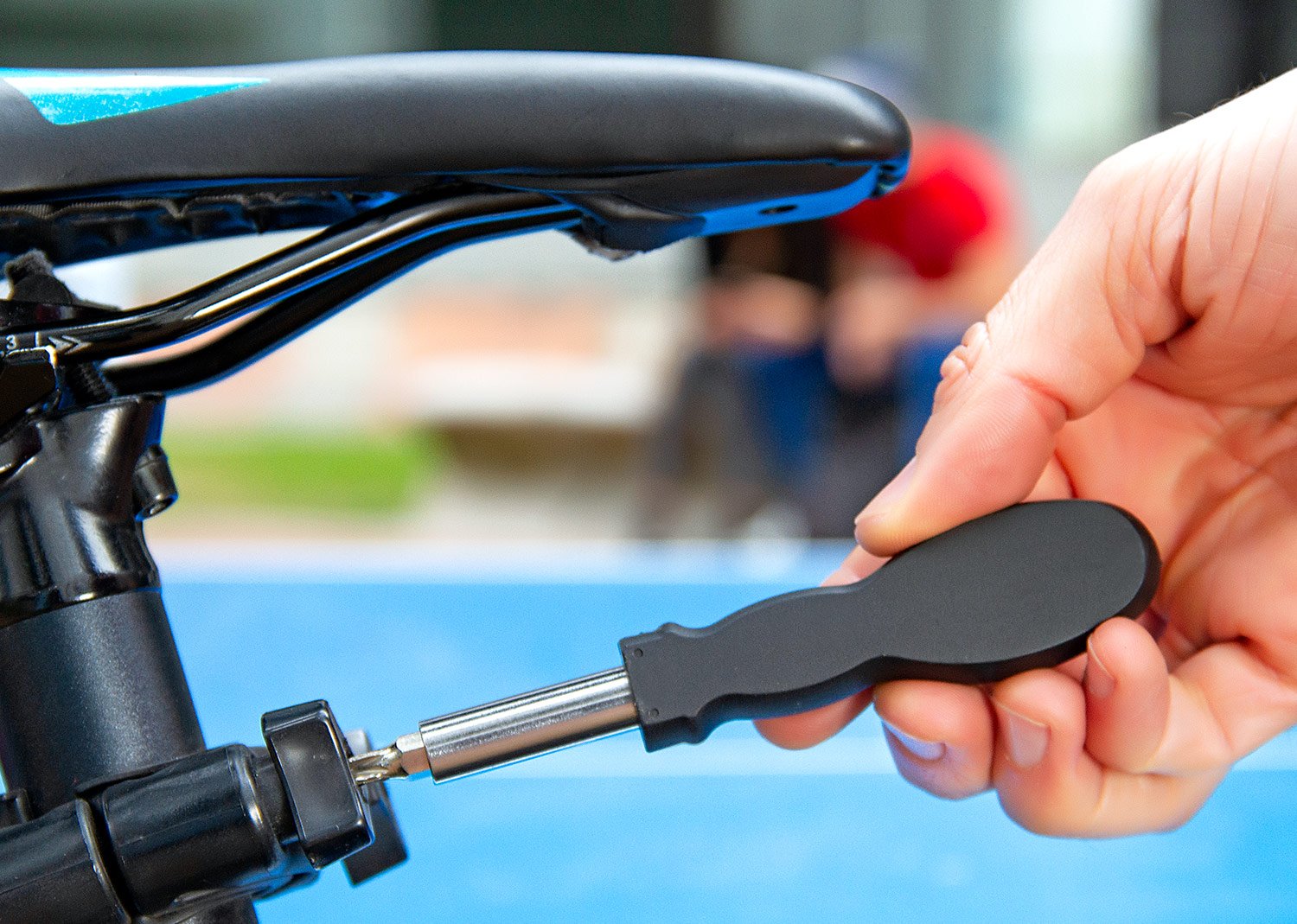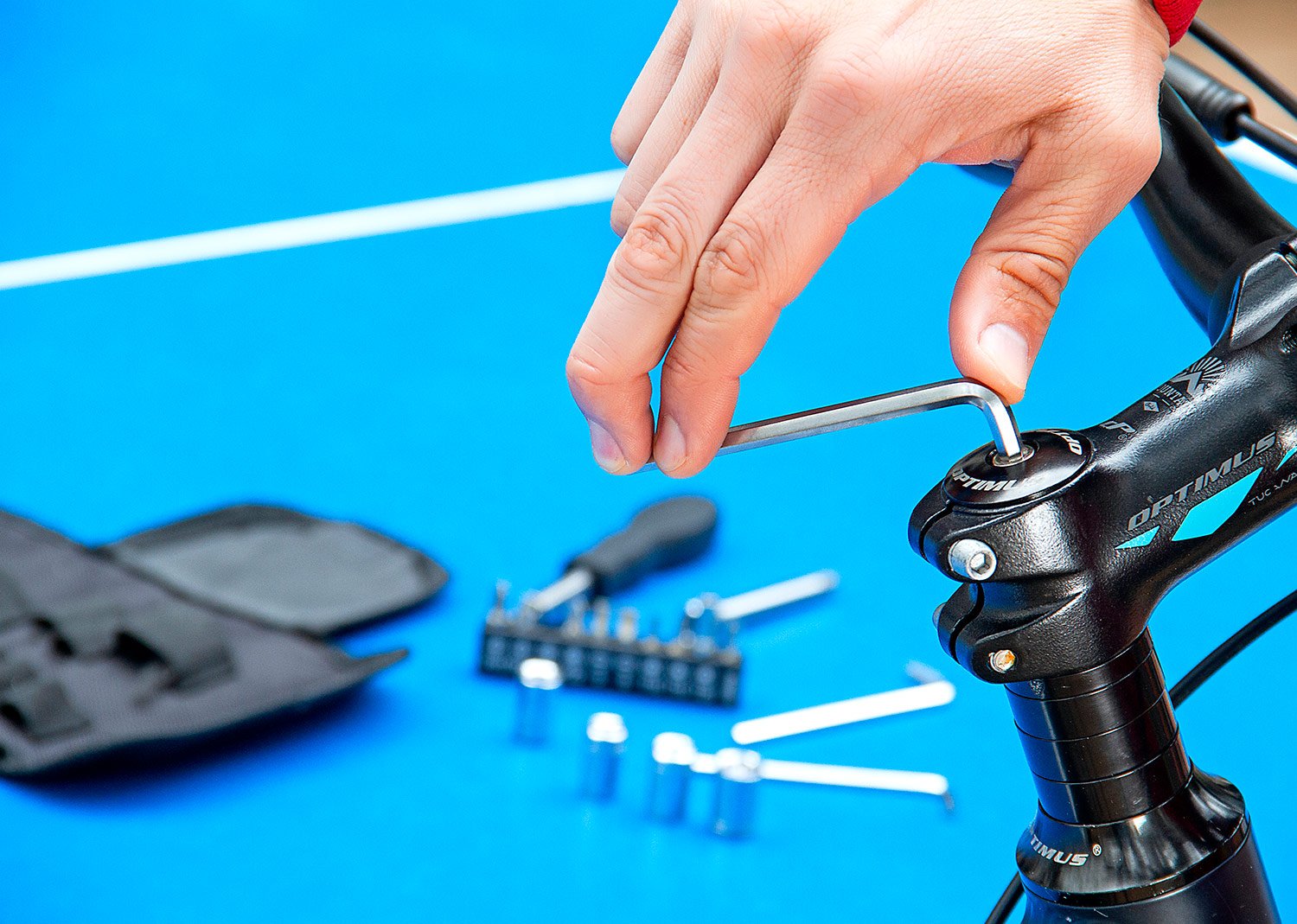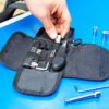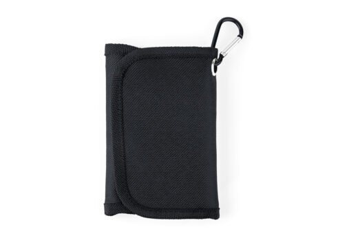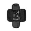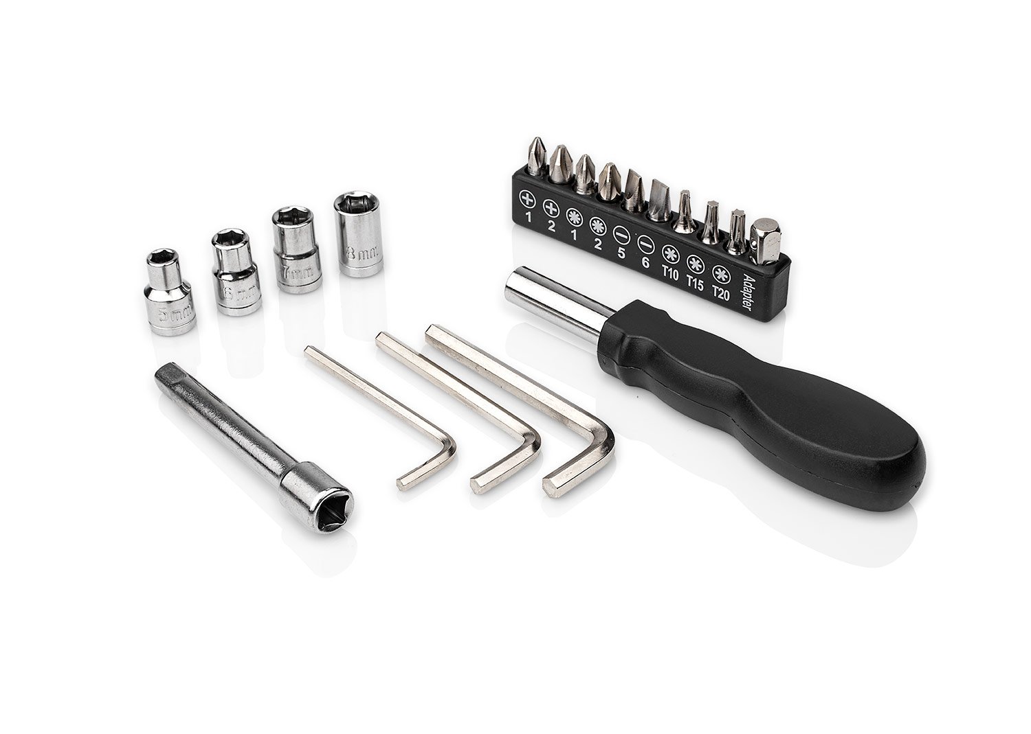 Set de herramientas presentado en estuche textil tipo sobre con cierres en velcro, carabinero y sujetadores elasticos al interior; incluye: Mango con adaptador, 9 puntas, 1 adaptador para copas, 1 extensor, 4 copas y 3 llaves hexagonales.