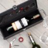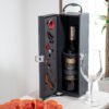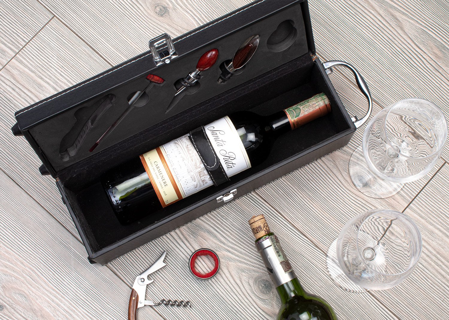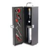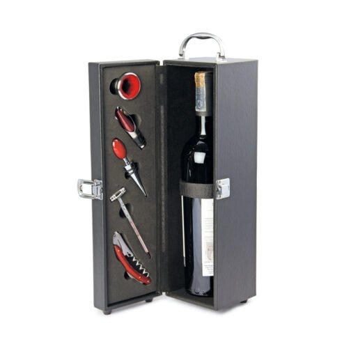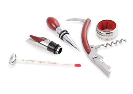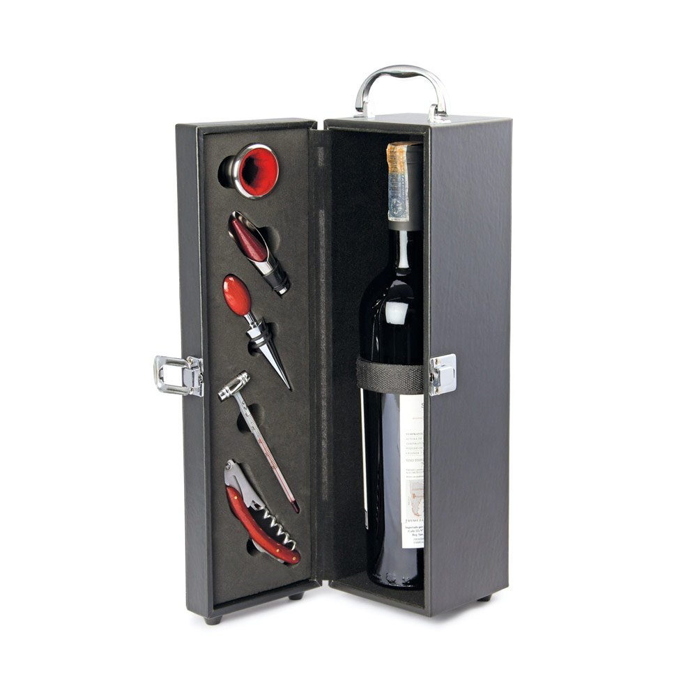 Contiene: Sacacorchos descapsulador de 1 tiempo, cortagotas, tapón metálico, termómetro y aro antigoteo, con apliques en madera. NO INCLUYE LA BOTELLA DE VINO.