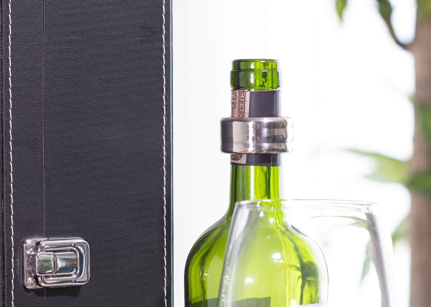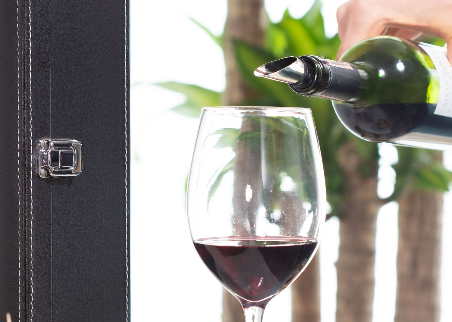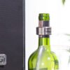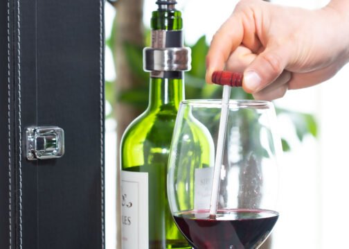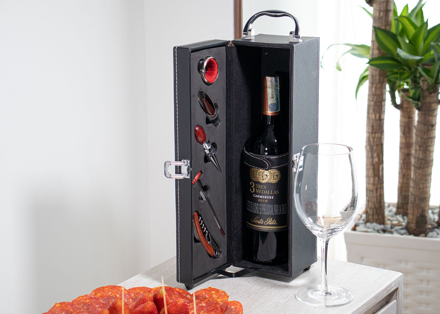 Contiene: Sacacorchos descapsulador de 1 tiempo, cortagotas, tapón metálico, termómetro y aro antigoteo, con apliques en madera. NO INCLUYE LA BOTELLA DE VINO.