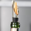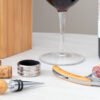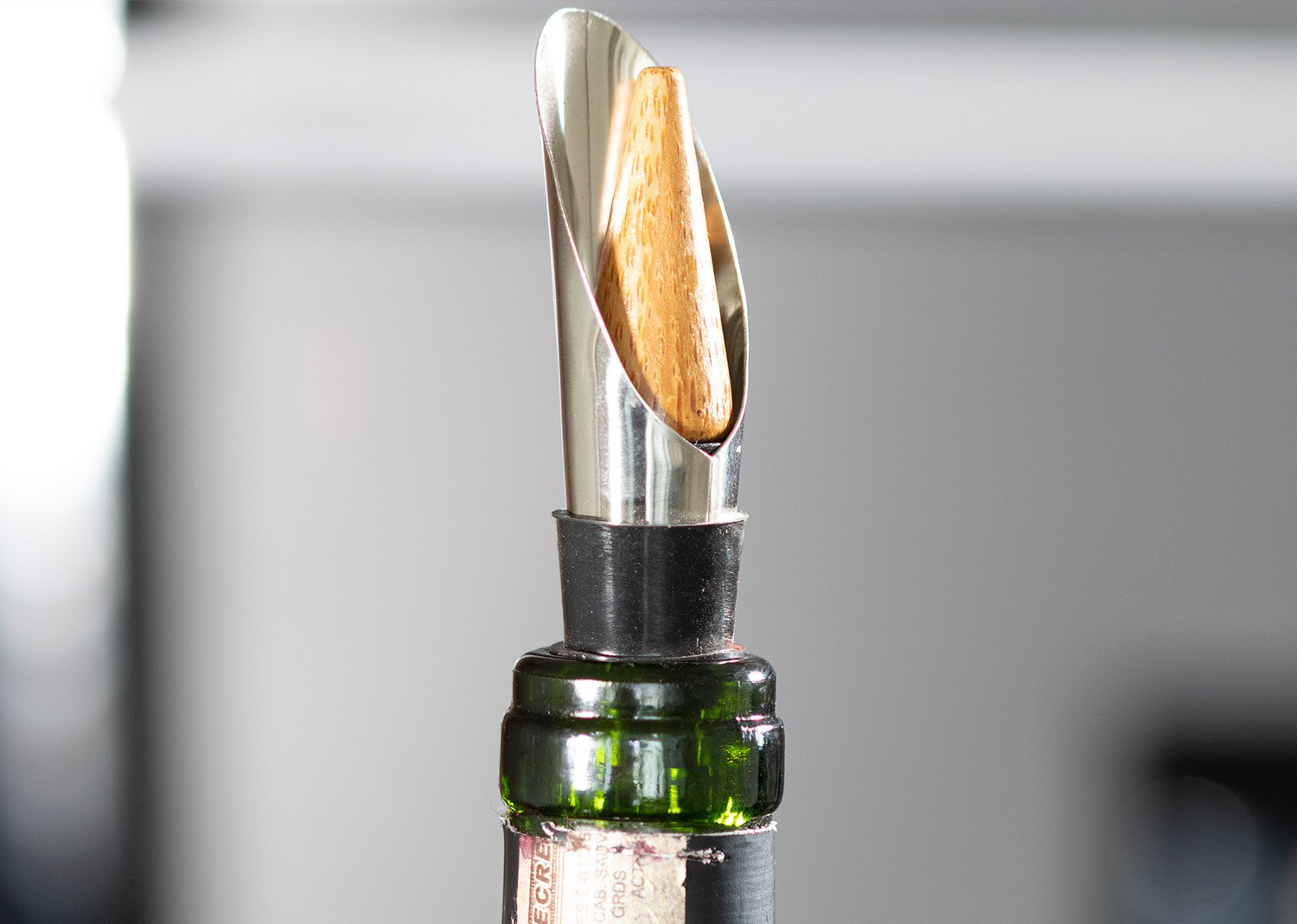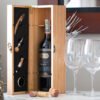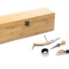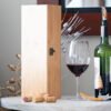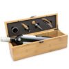 Contiene: 4 accesorios de bar con aplique en madera: Sacacorchos descapsulador de 1 tiempo, cortagotas, tapón metálico y aro antigoteo. NO INCLUYE LA BOTELLA DE VINO.