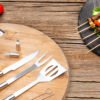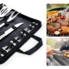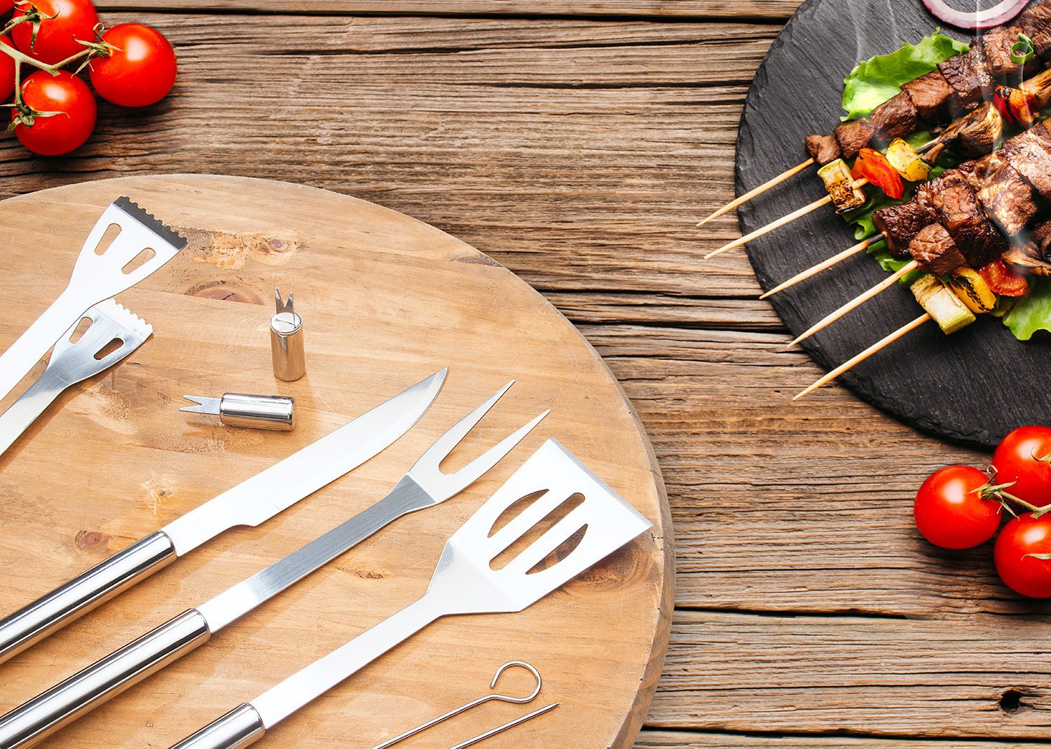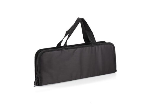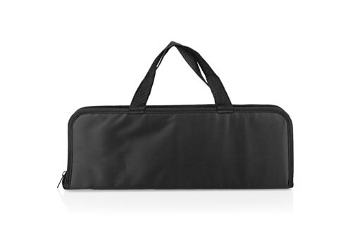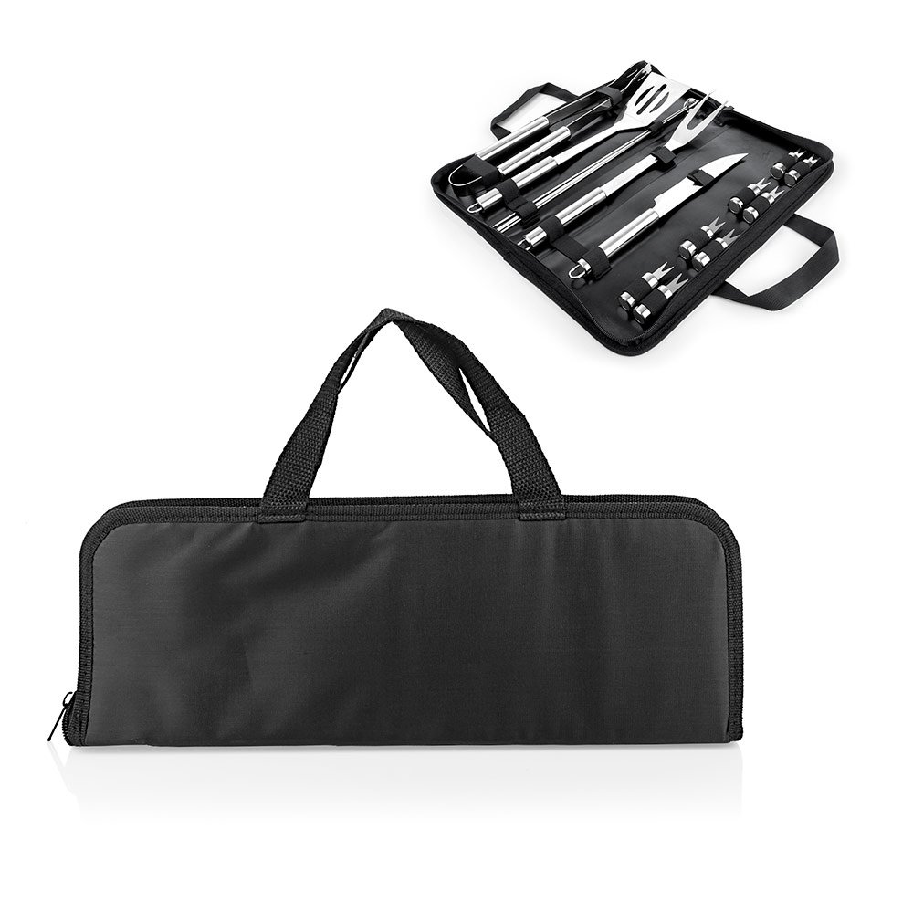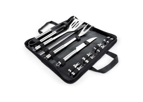 Set BBQ x 16 pcs Incluye: Pala barbacoa, Cuchillo, Tenedor de parrilla, set x 4 brochetas, set x 8 tenedores para maíz y Pinzas de parrilla, con estuche textil, cierre en cremallera y manijas.