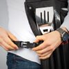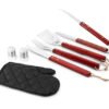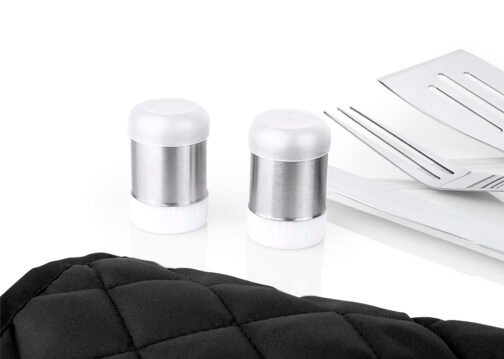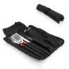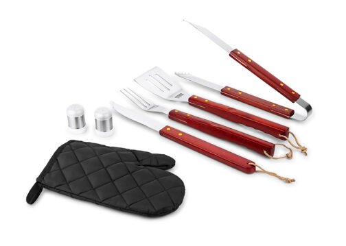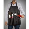 Set de BBQ compuesto por el estuche delantal con broches, correa ajustable y 7 utensilios: pinzas, espátula, trinche, cuchillo, guante, salero y pimentero.