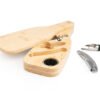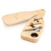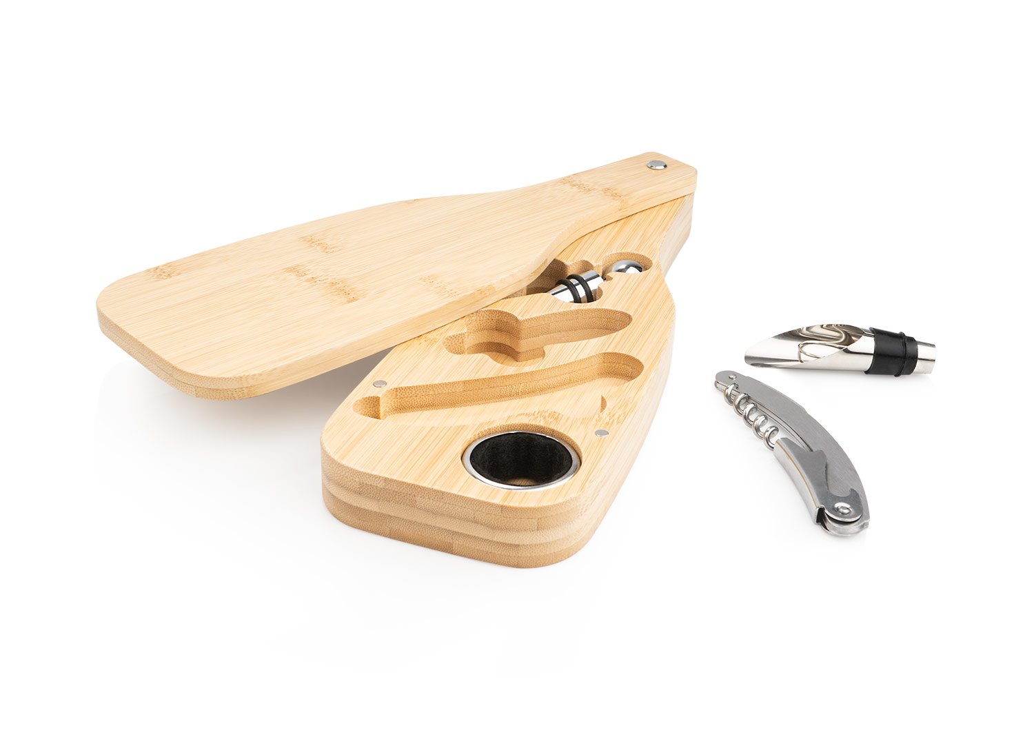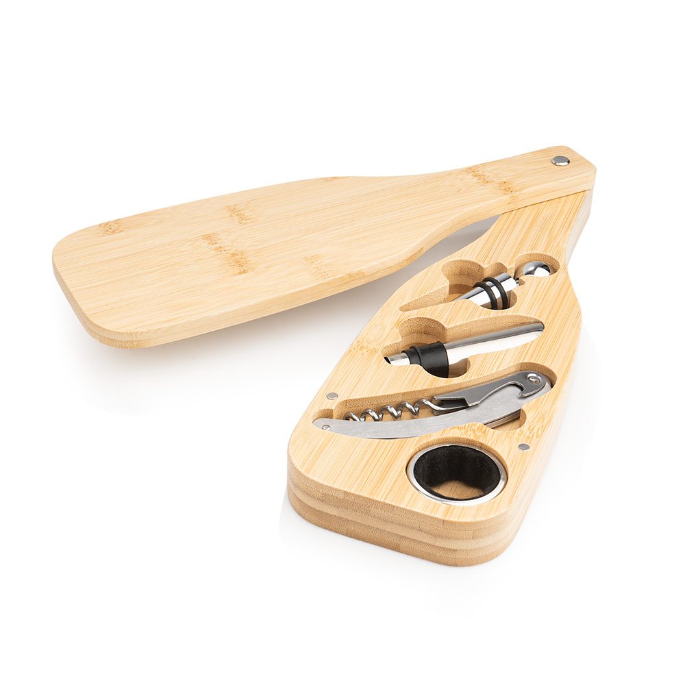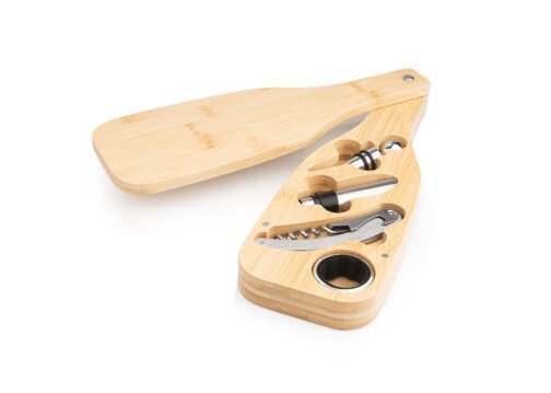 Set de vino con forma de botella, elaborado en bambú, con 4 accesorios de acero inoxidable. Incluye sacacorchos descapsulador de un tiempo, cortagotas, tapón metálico y aro antigoteo.