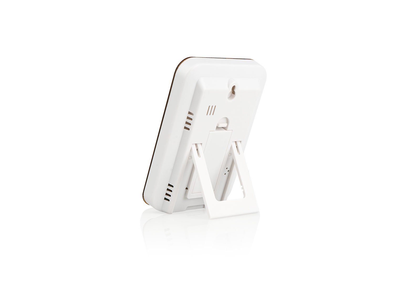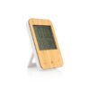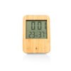 Reloj digital de escritorio con múltiples funciones que permite conocer la temperatura y la humedad ambiental. Panel en bambú. Puede cambiar la medición entre grados Celsius (°C) y grados Fahrenheit (°F). Funciona con 2 baterías AAA (no incluidas).