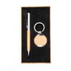 Set ejecutivo, incluye llavero circular metálico y bolígrafo en Aluminio con sistema twist ambos con acabados en bambú para la marca en láser. Empaque caja con papel forrado imitación bambú.
