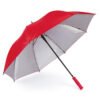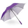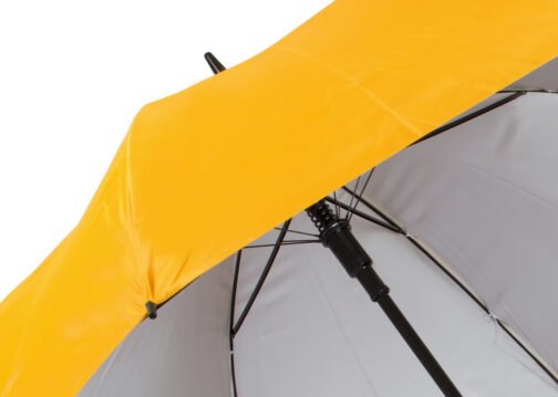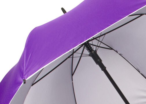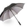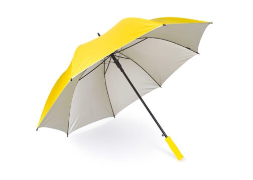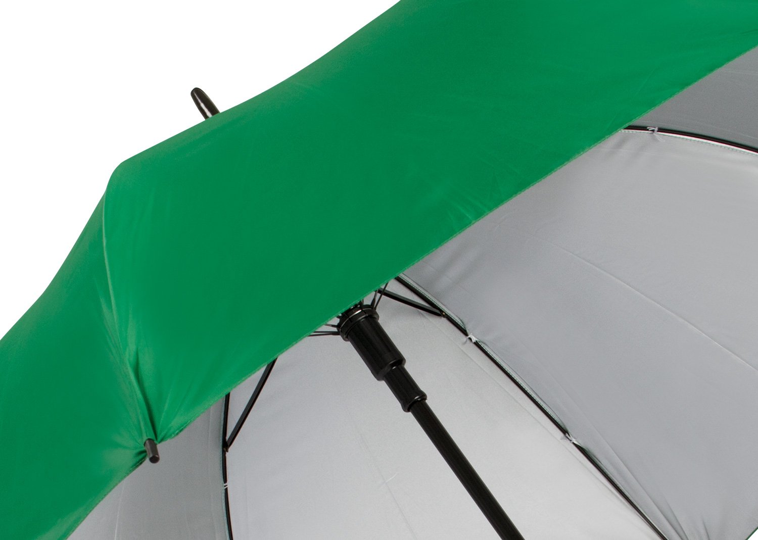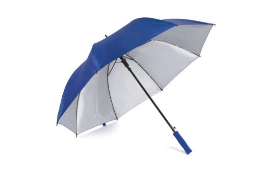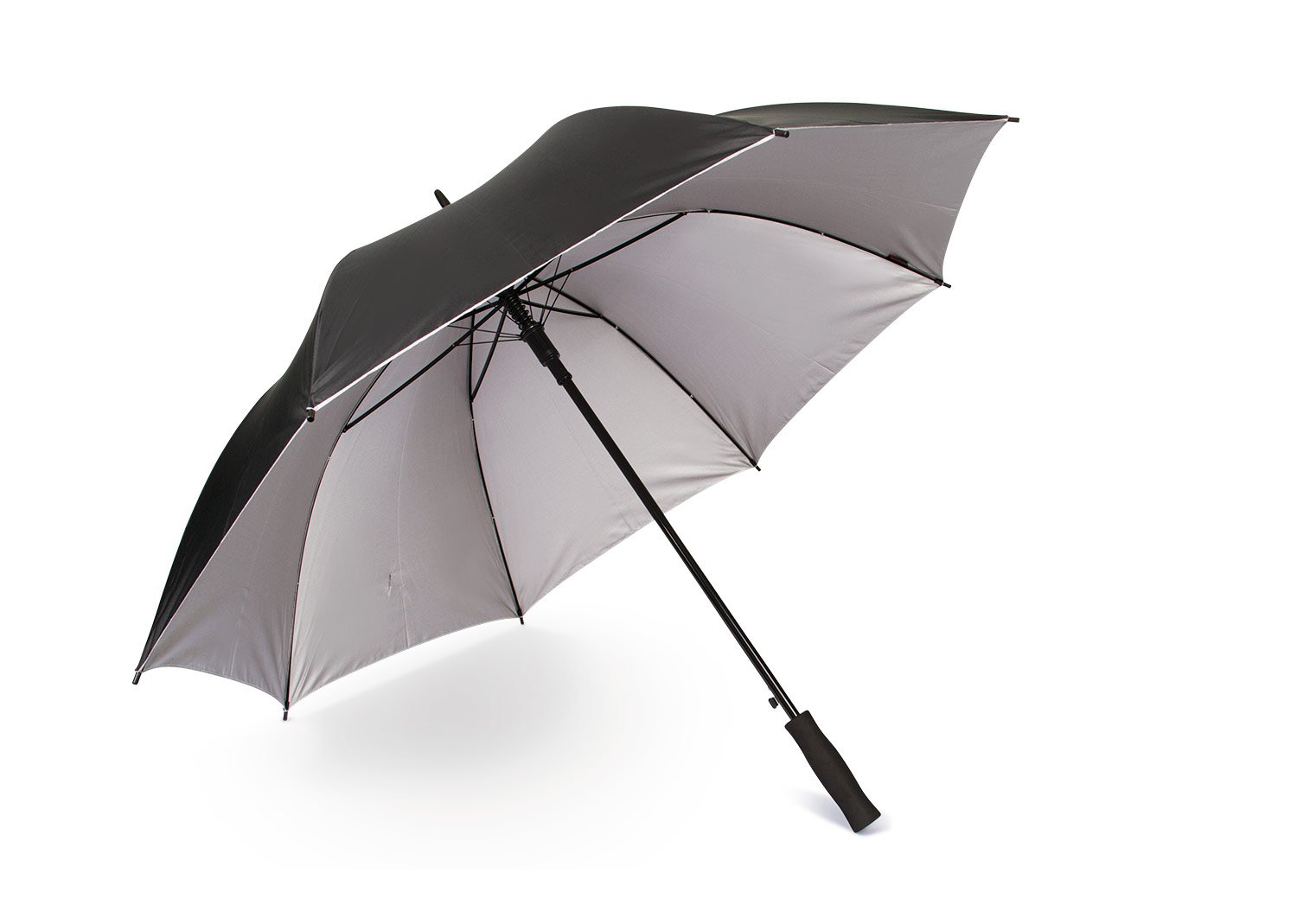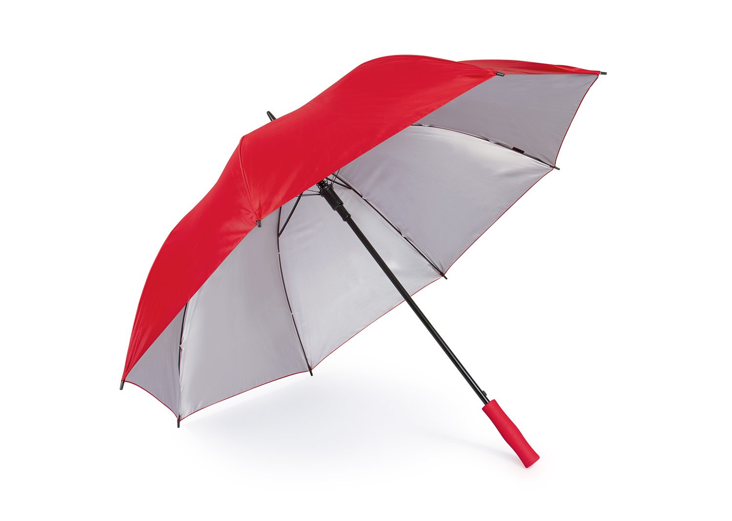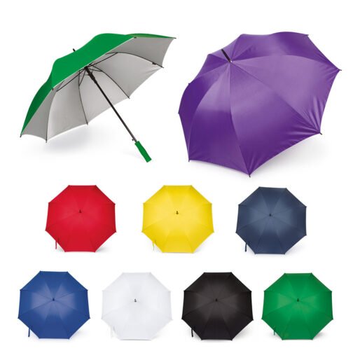 Paraguas tipo Golf con doble recubrimiento interior plateado. Apertura automática y cierre manual. Mango recto del mismo color de la tela.