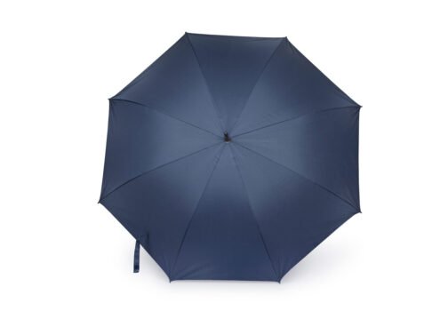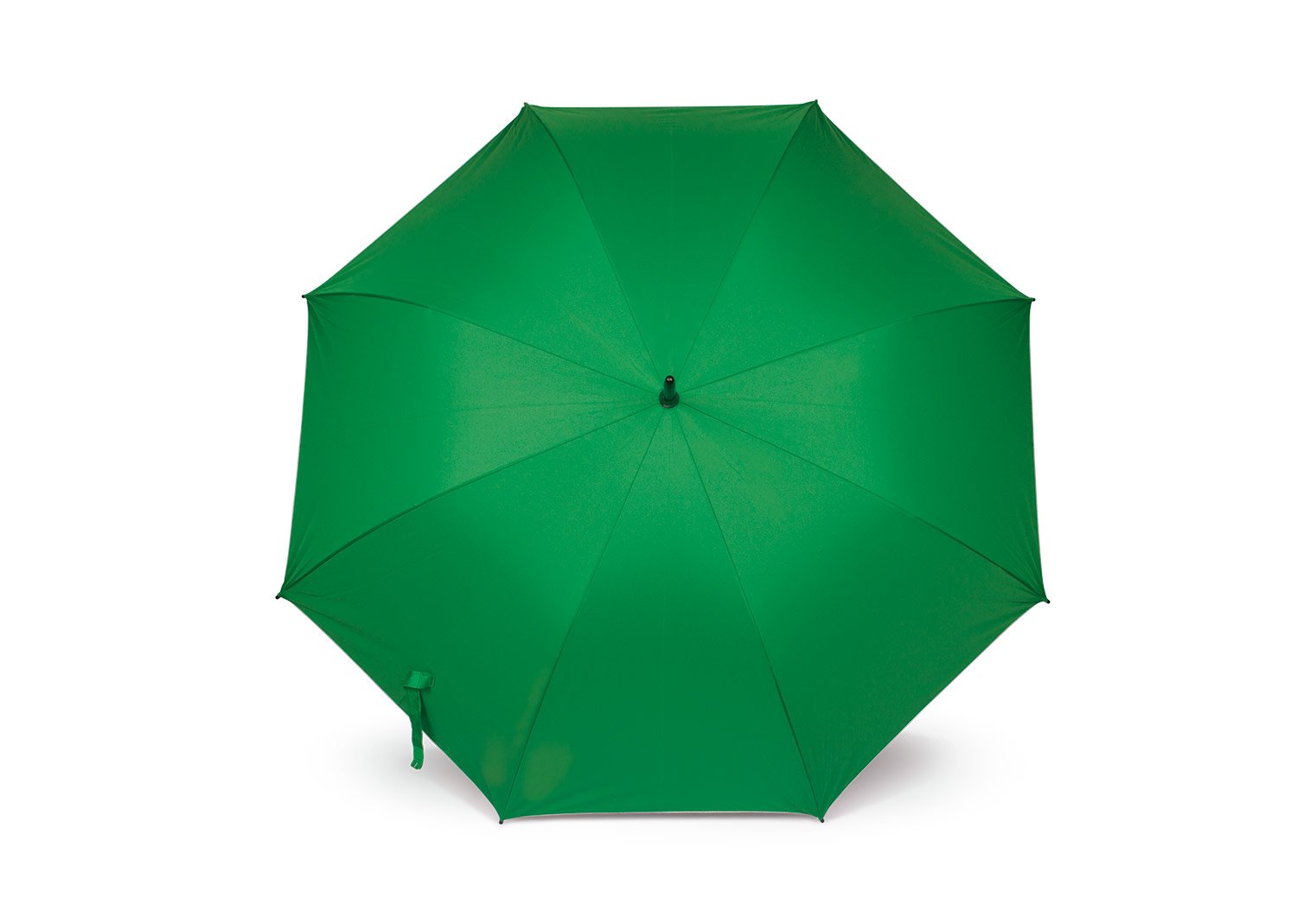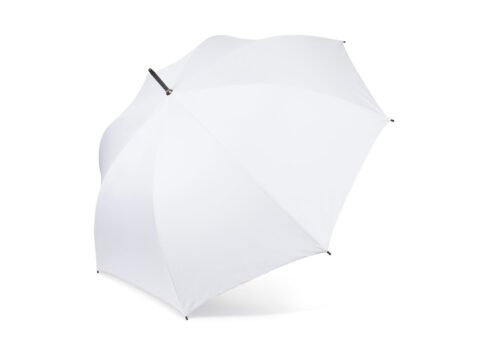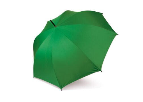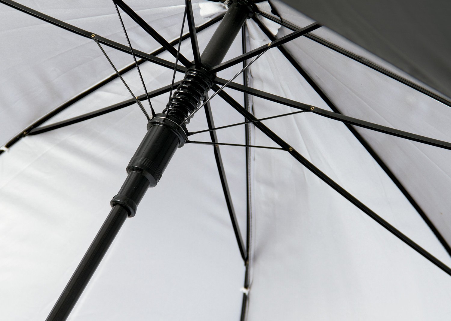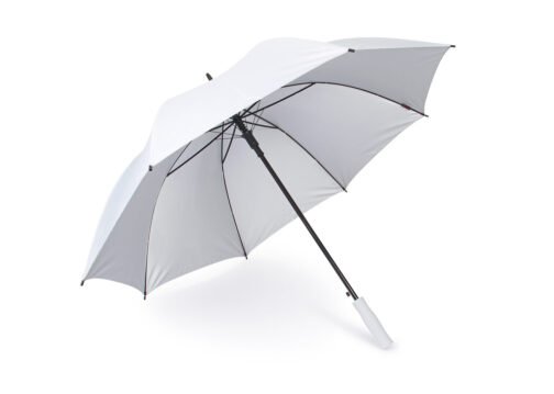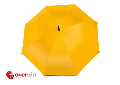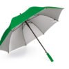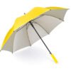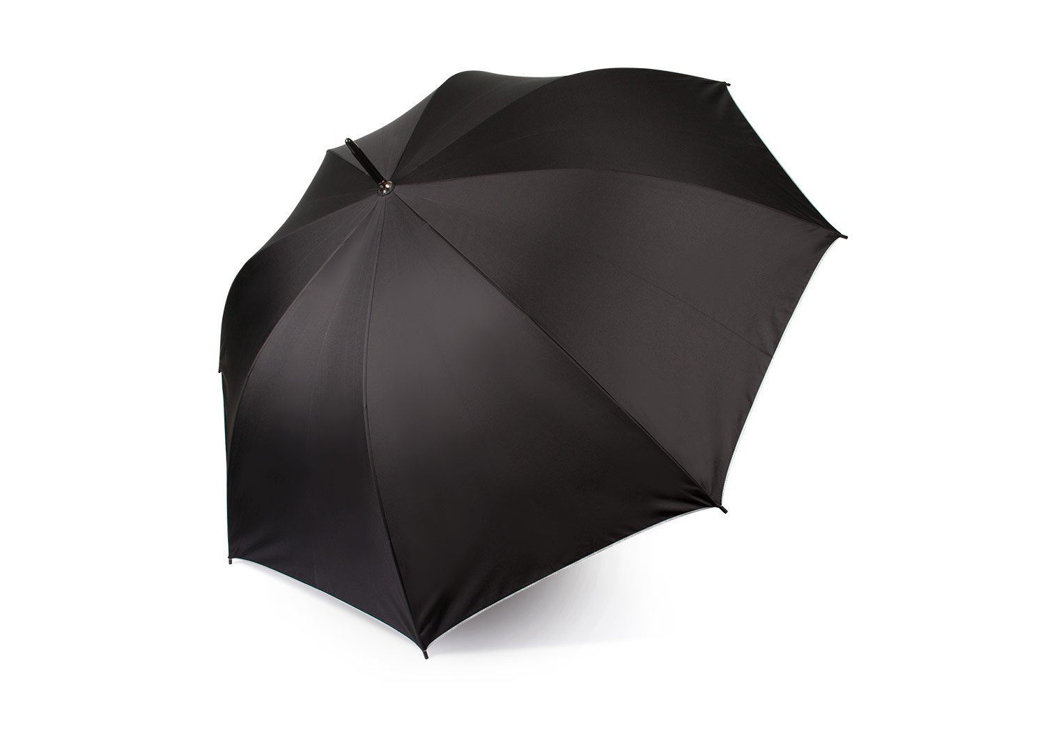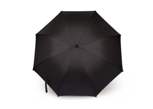 Paraguas tipo Golf con doble recubrimiento interior plateado. Apertura automática y cierre manual. Mango recto del mismo color de la tela.
