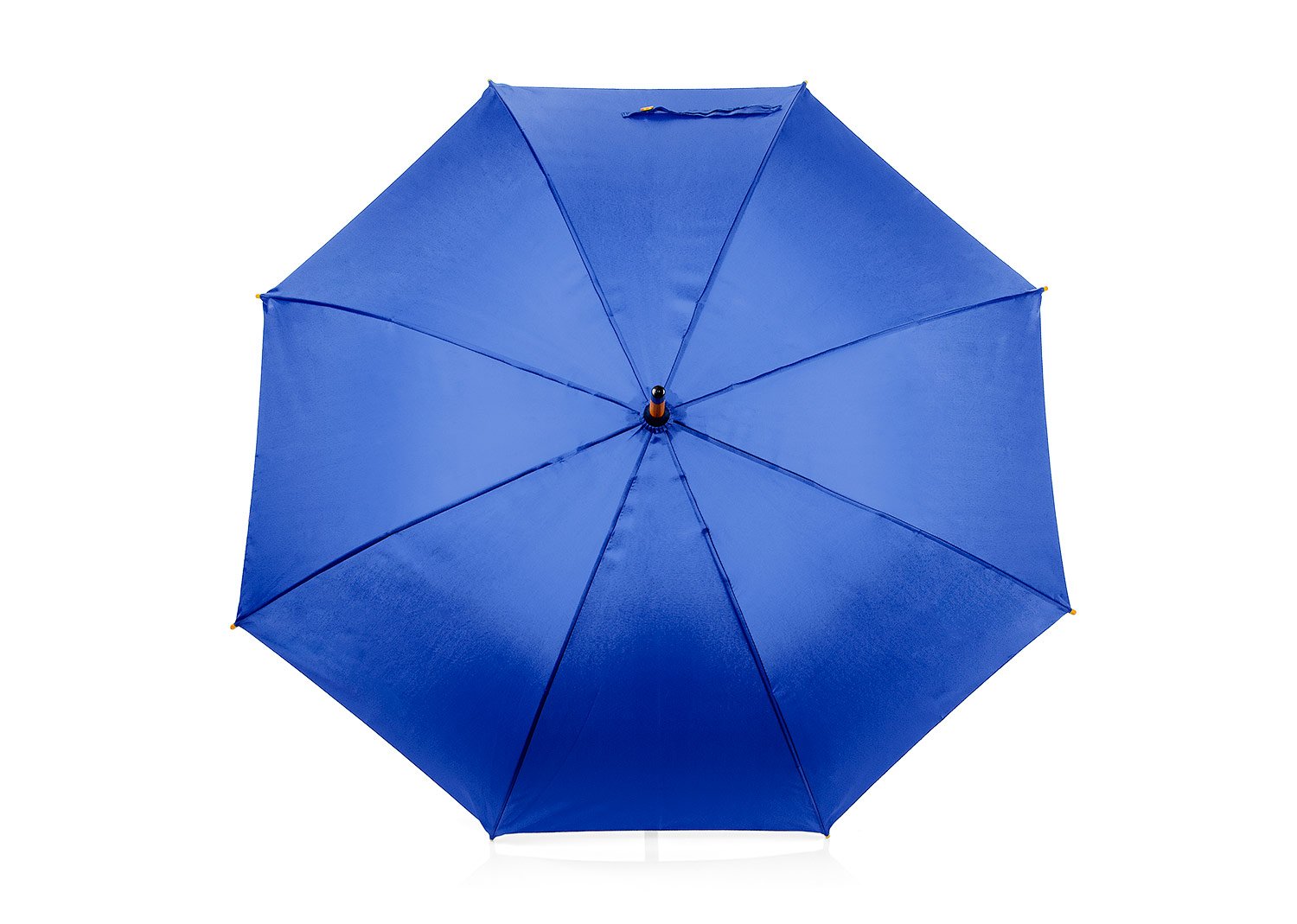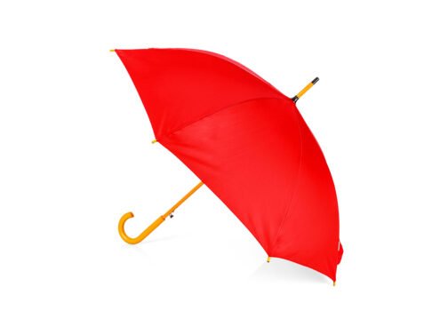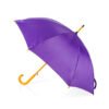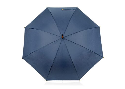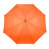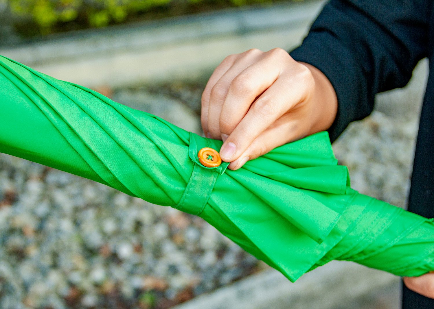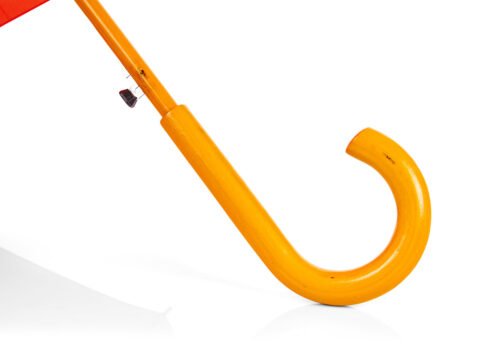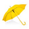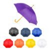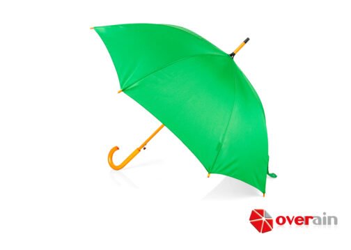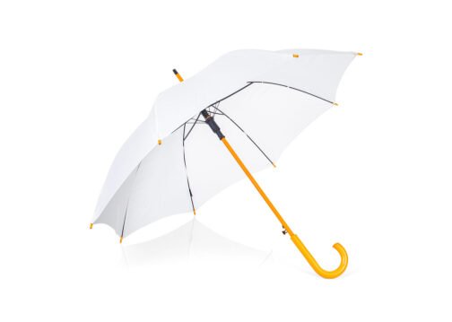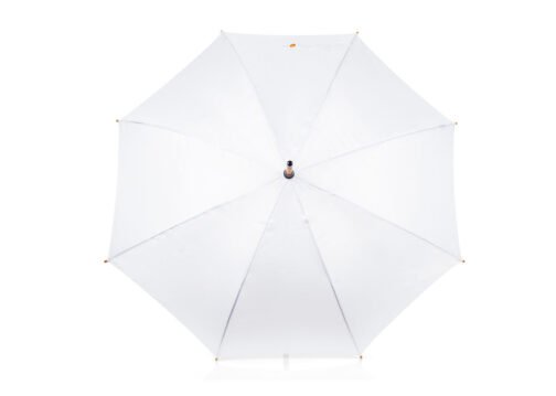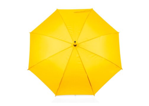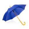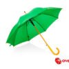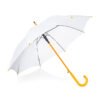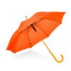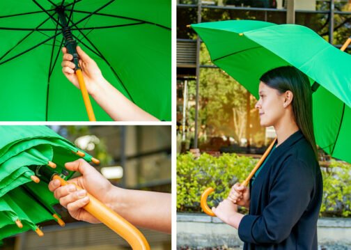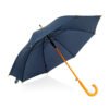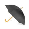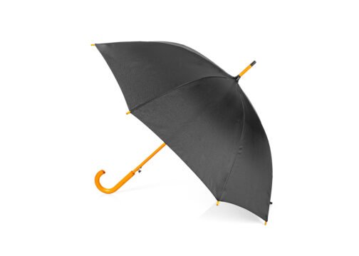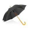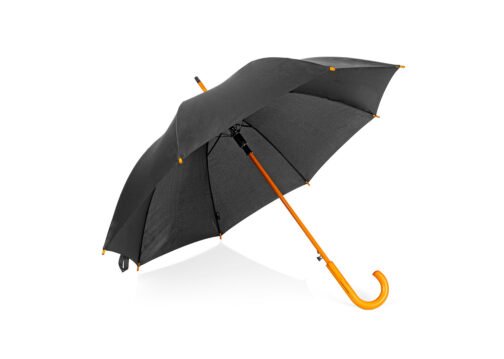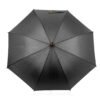 Paraguas mango curvo, de apertura automática y cierre manual. Costillas de acabado negro. Cierre con botón de madera.