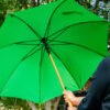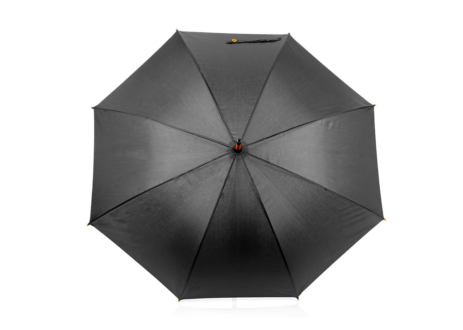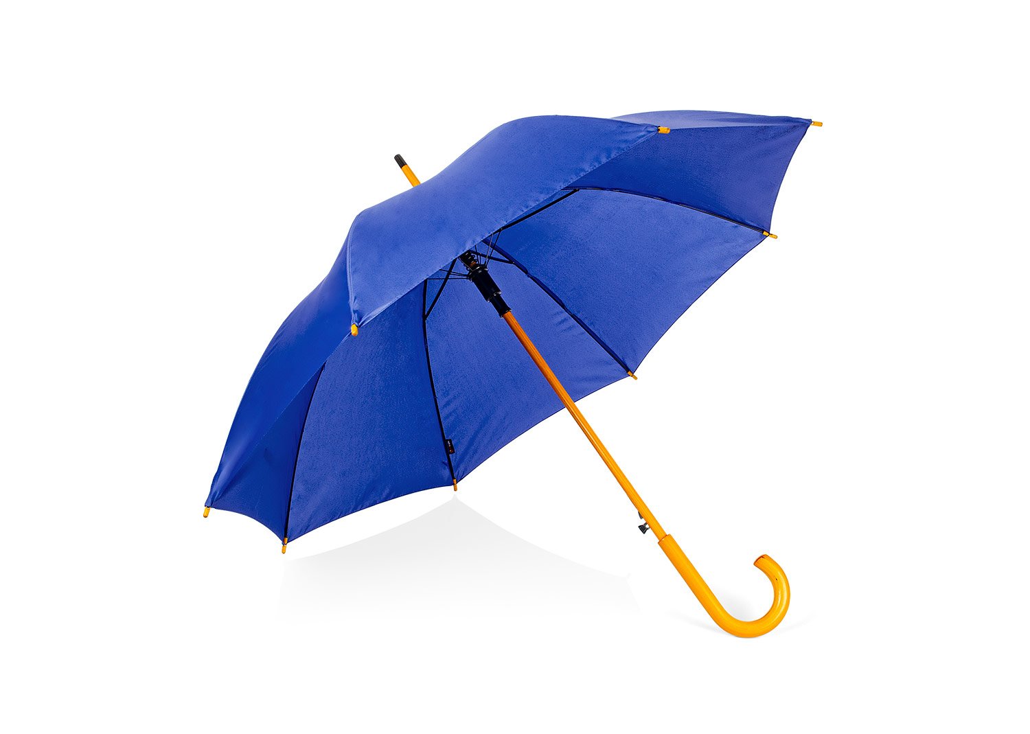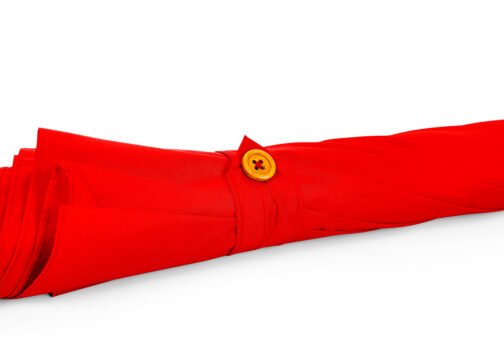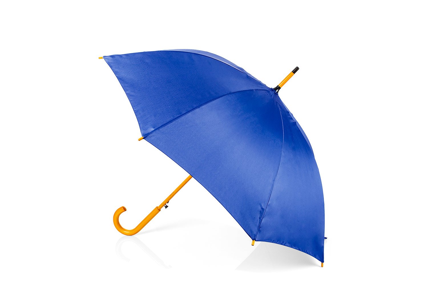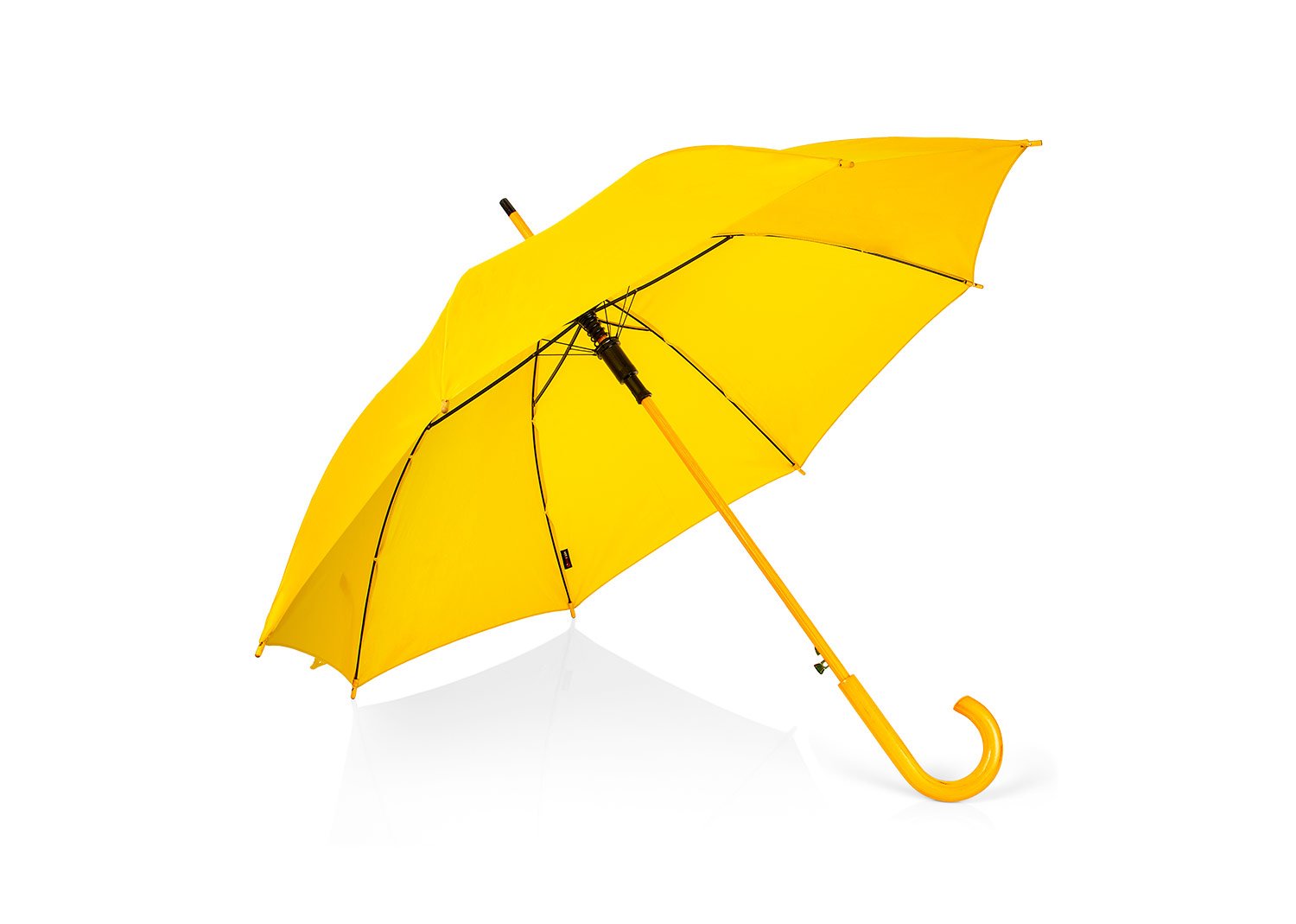 Paraguas mango curvo, de apertura automática y cierre manual. Costillas de acabado negro. Cierre con botón de madera.