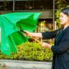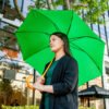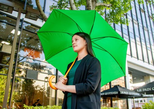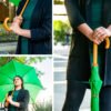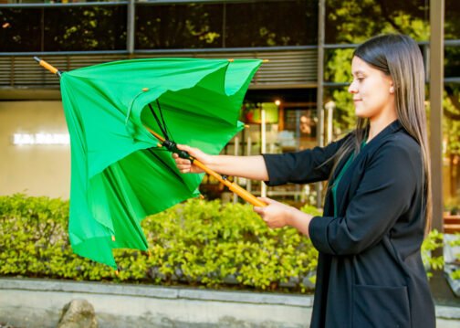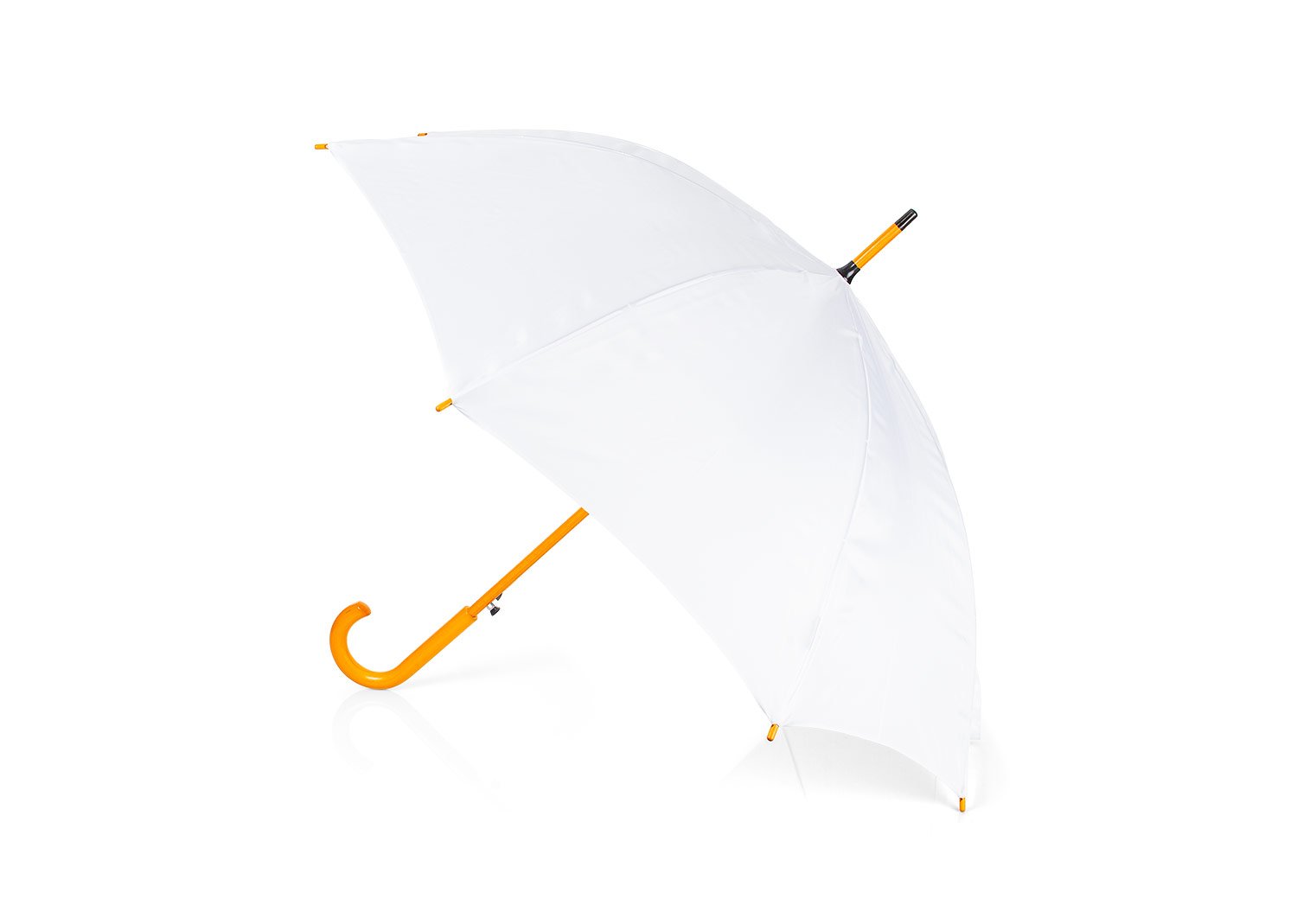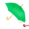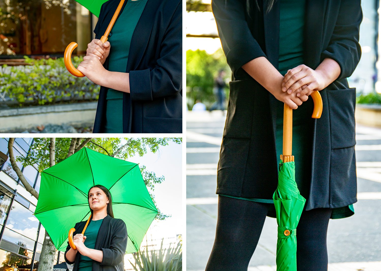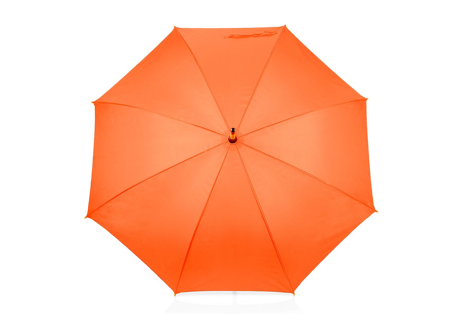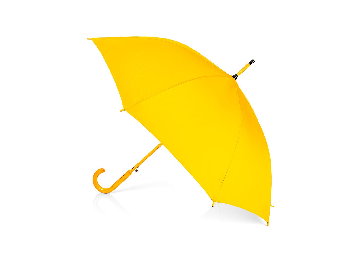 Paraguas mango curvo, de apertura automática y cierre manual. Costillas de acabado negro. Cierre con botón de madera.