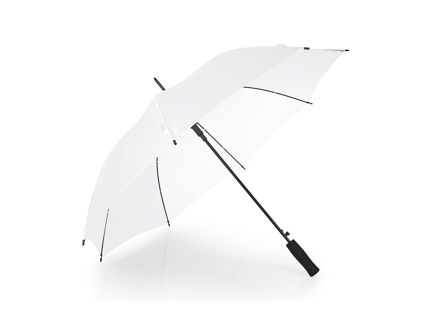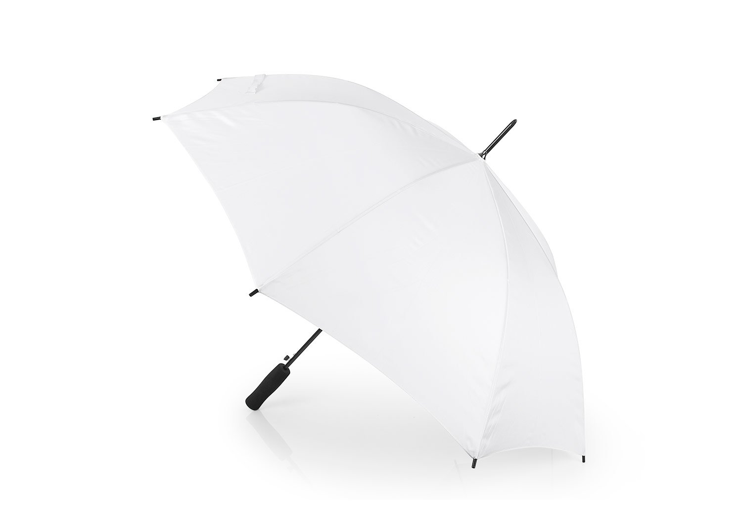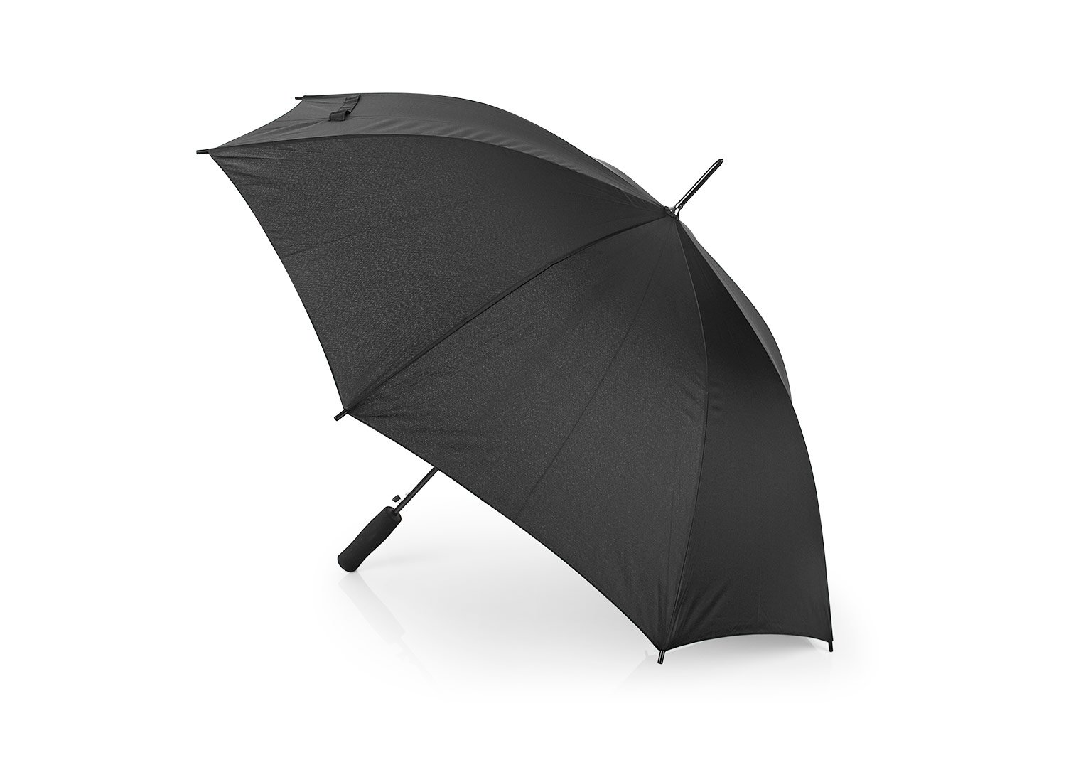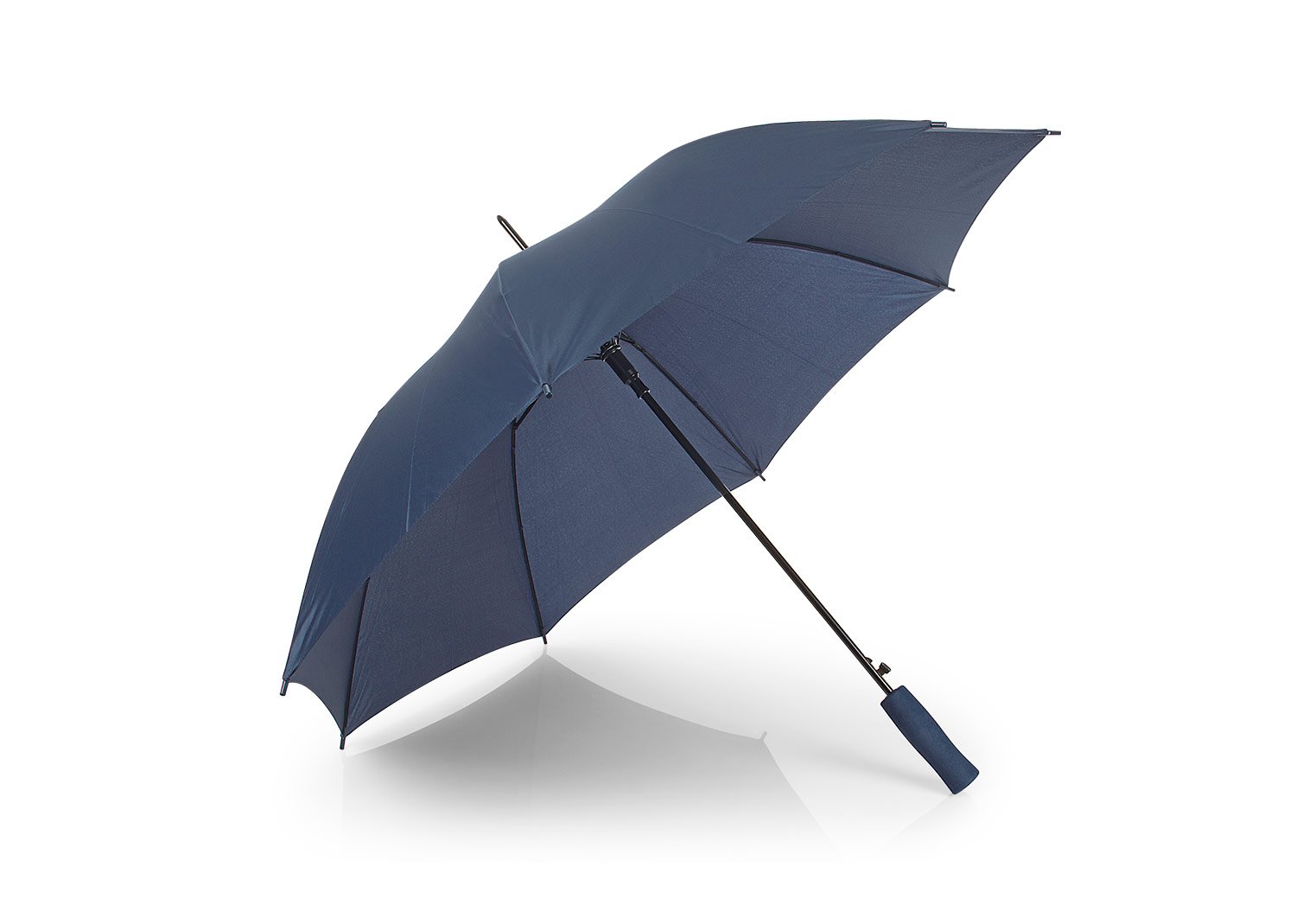 Apertura automática y cierre manual, marco y costillas chapadas. Mango en goma EVA del mismo color del paraguas. Tela pongee 190t, puntas de plástico.