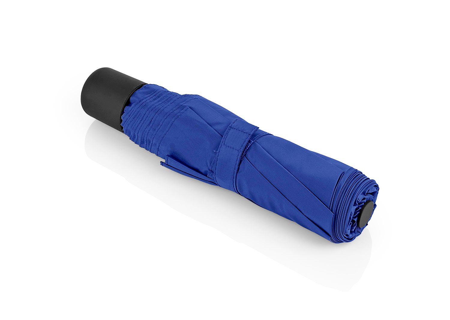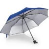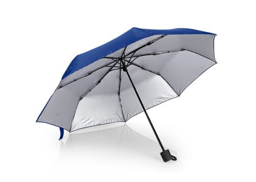 Paraguas 21» con sistema apertura y cierrre manual en 3 secciones, 8 cascos, varillas de fibra de vidrio, manco en acabado de goma, tela de poliéster 190t con recubrimiento interior plateado, incluye funda del color de paraguas.