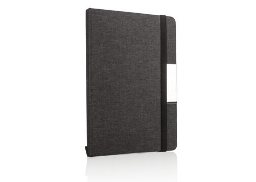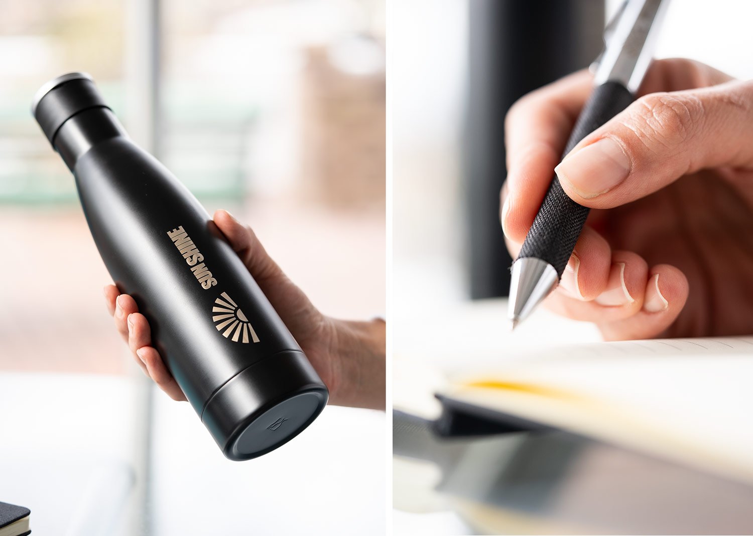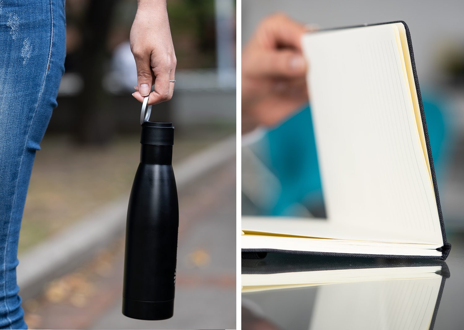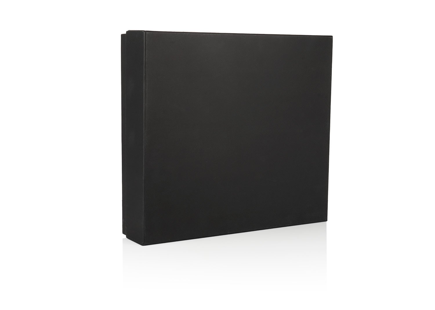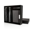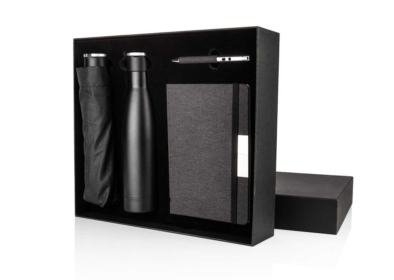 Set ejecutivo con estuche de lujo. Incluye bolígrafo en aluminio con sistema twist, libreta con 80 hojas rayadas, banda elástica de cierre lateral, cinta separadora y portabolígrafo. Además, botella de doble pared de 600 ml / 20 Oz en acero inoxidable con tapa de rosca y banda de silicona para transportar con facilidad. Además incluye un paraguas mini.