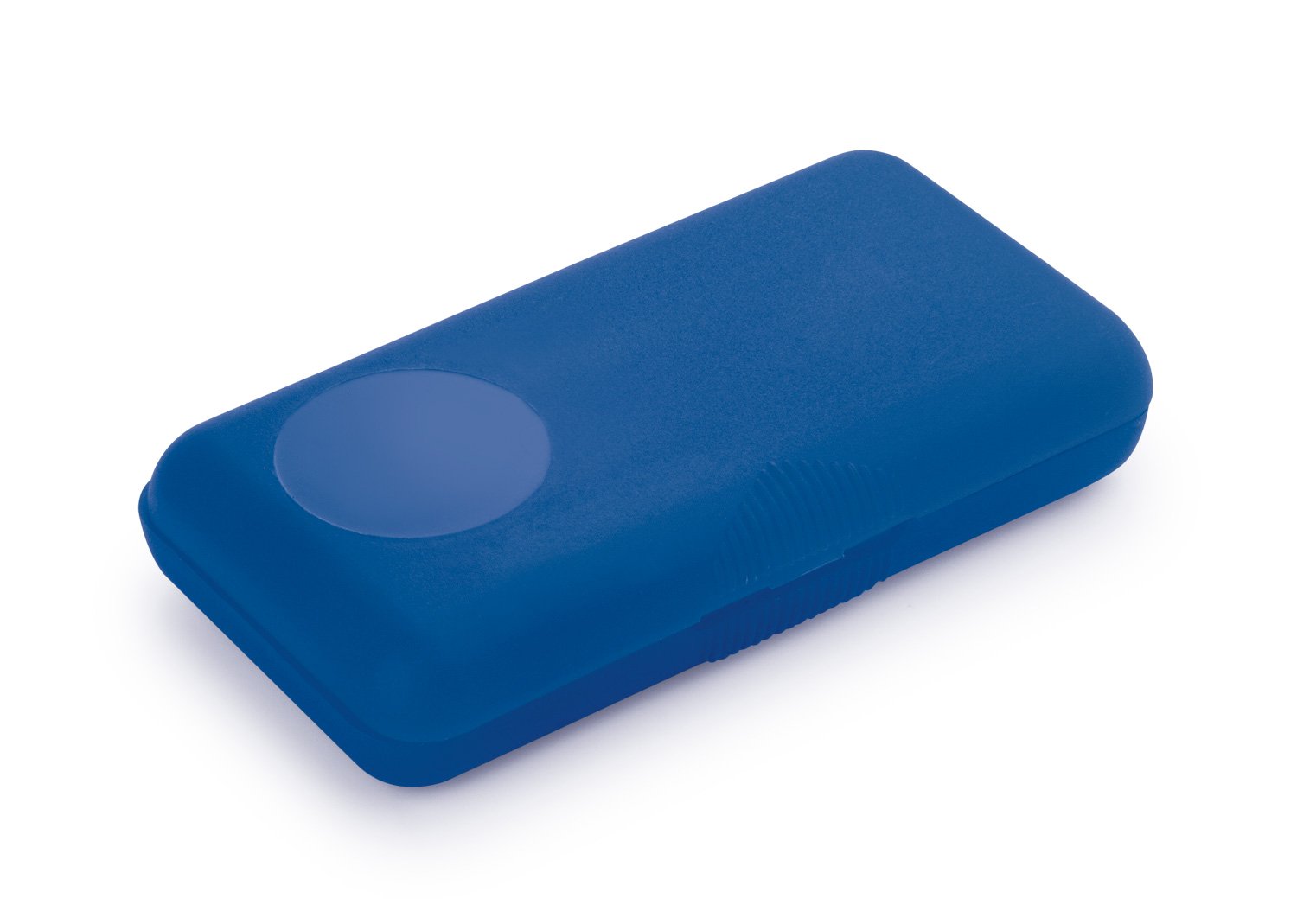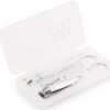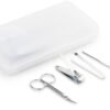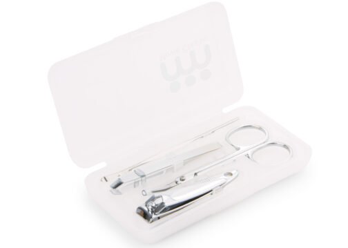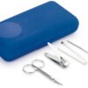 Set de manicure en estuche plástico compacto. Incluye: Cortauñas, tijeras, pinzas y bajacutículas.