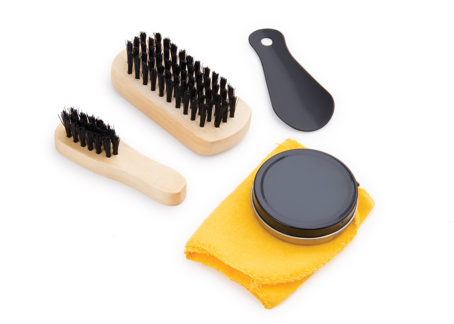 Set de limpieza para zapatos en caja metálica. Incluye: Paño, betún, 2 cepillos y calzador.