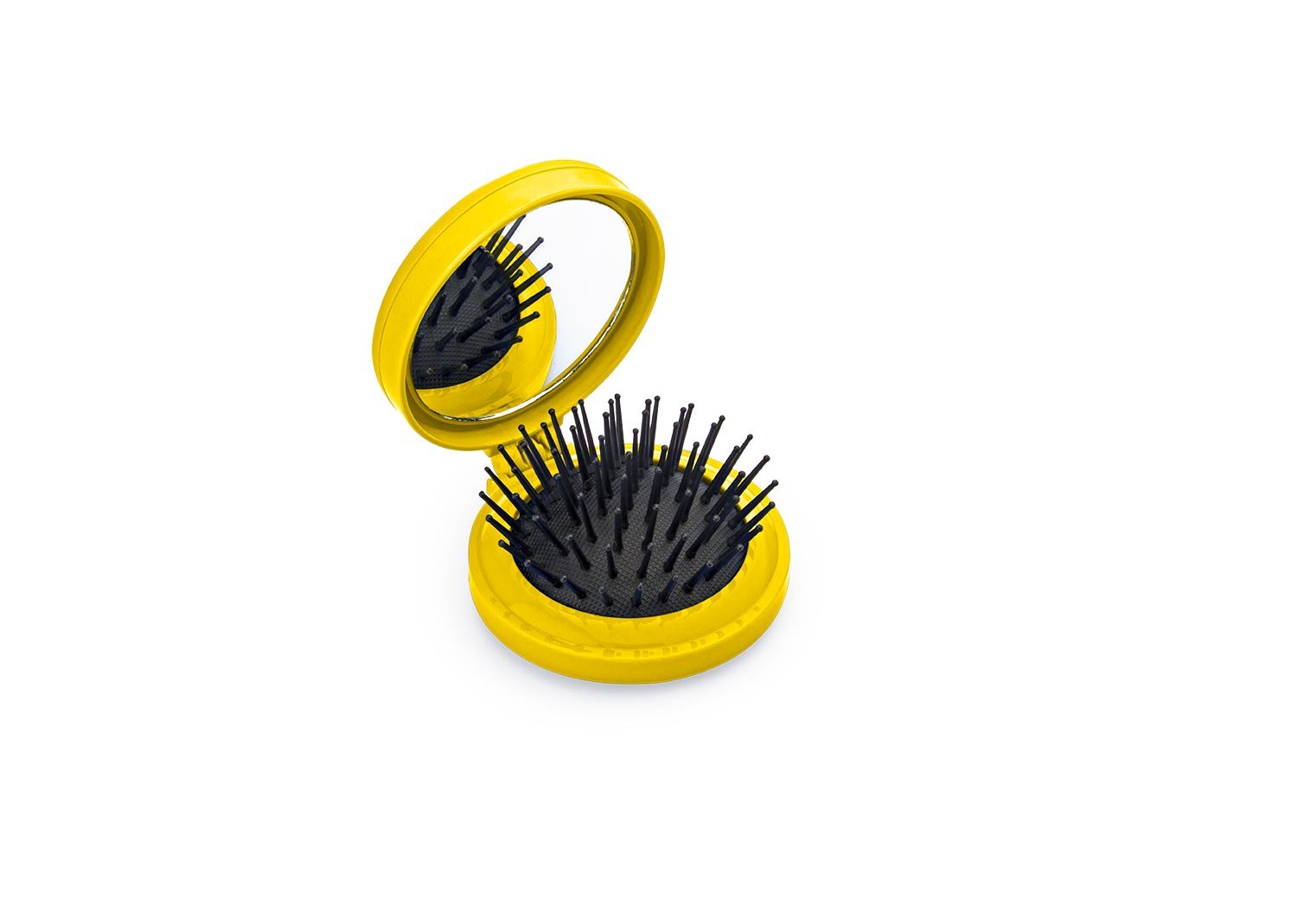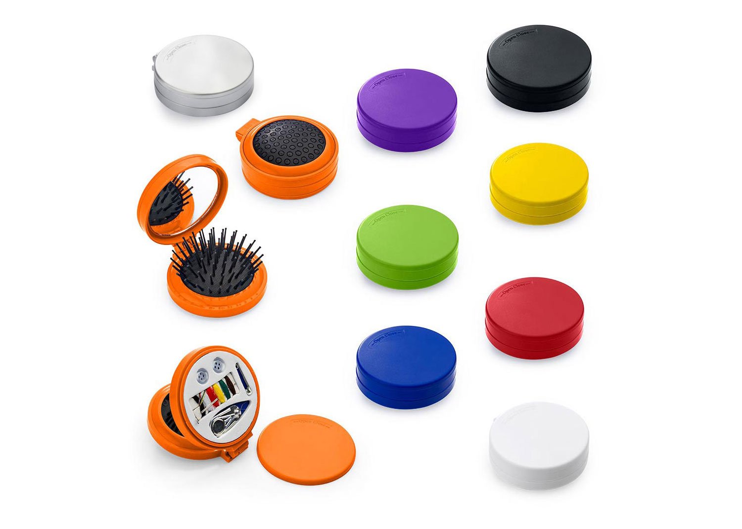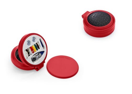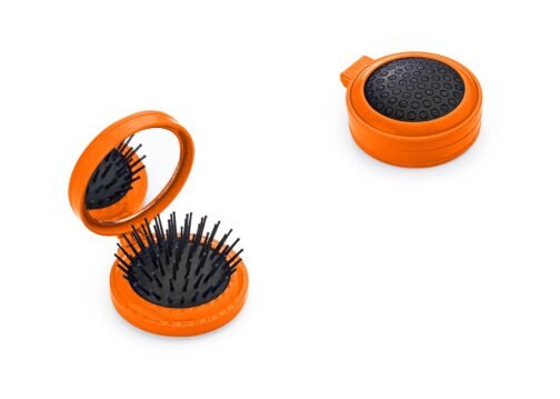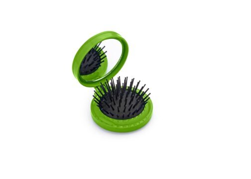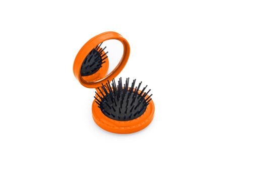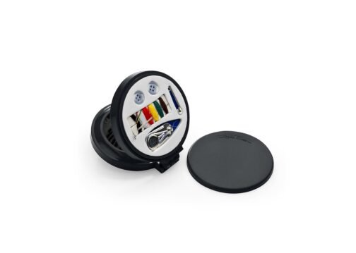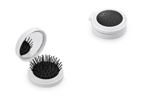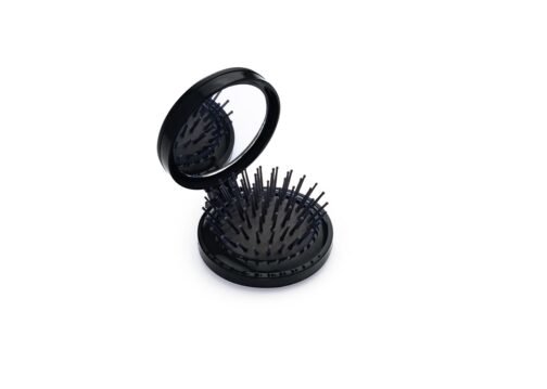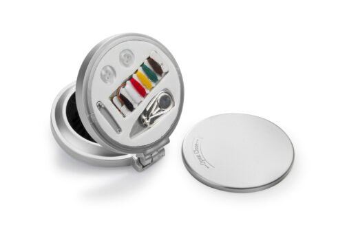Espejo con cepillo redondo para cabello. Incluye un costurero con 6 hilos de colores, 2 agujas, gancho nodriza, enhebrador y 2 botones.