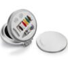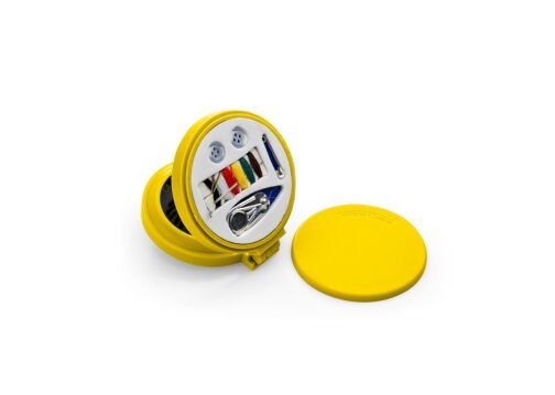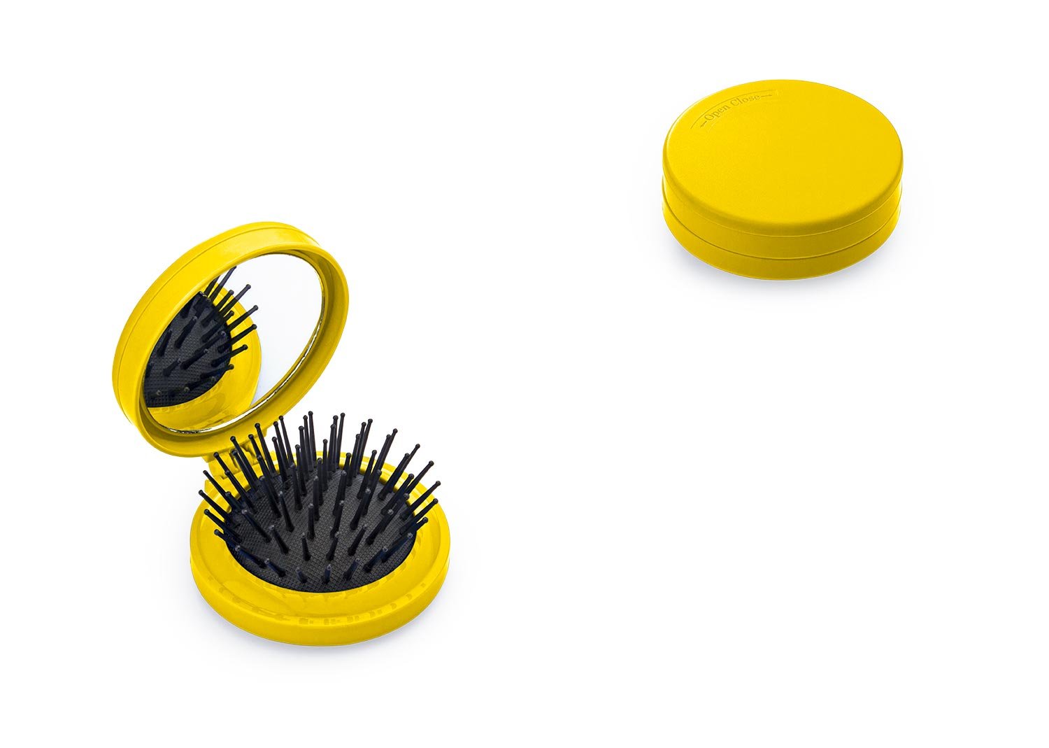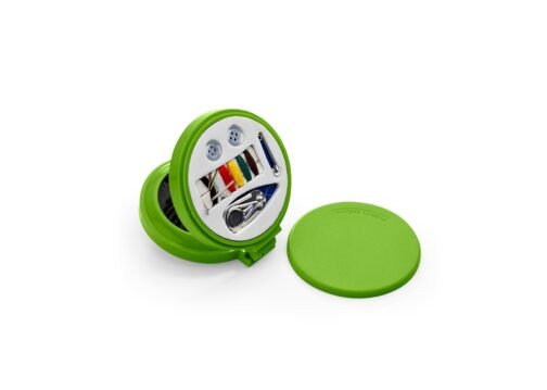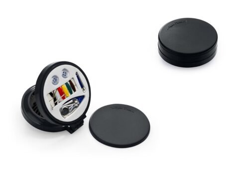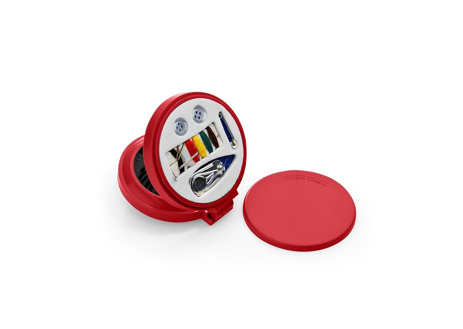 Espejo con cepillo redondo para cabello. Incluye un costurero con 6 hilos de colores, 2 agujas, gancho nodriza, enhebrador y 2 botones.
