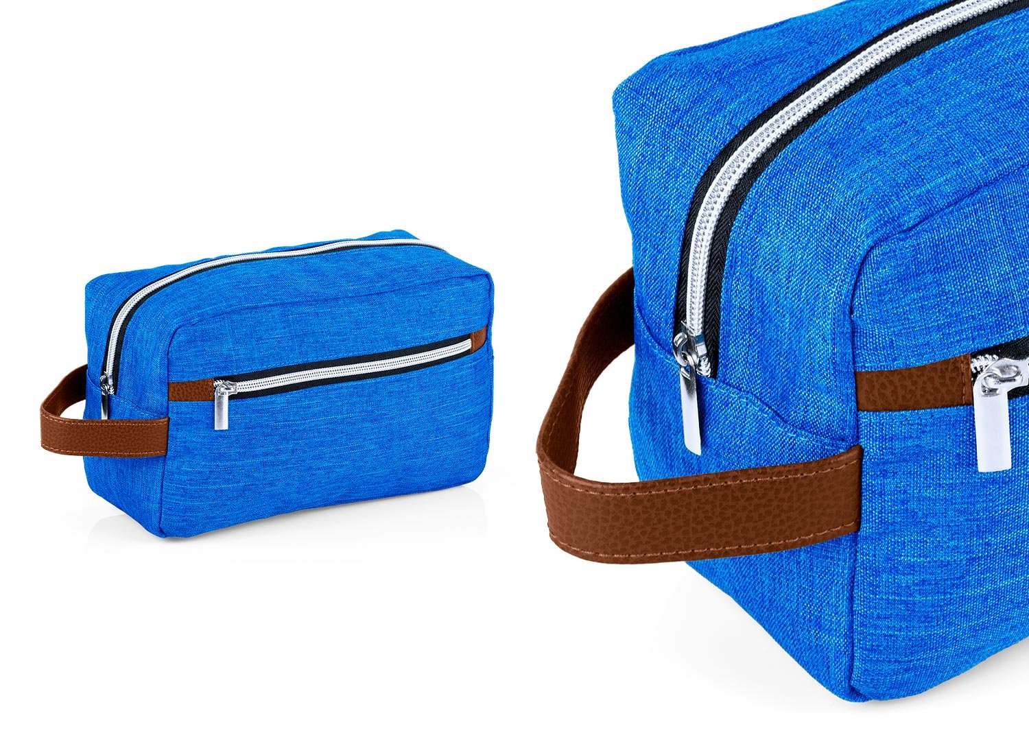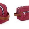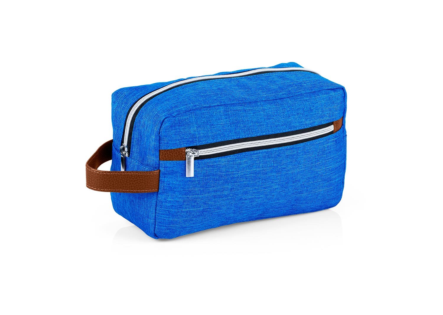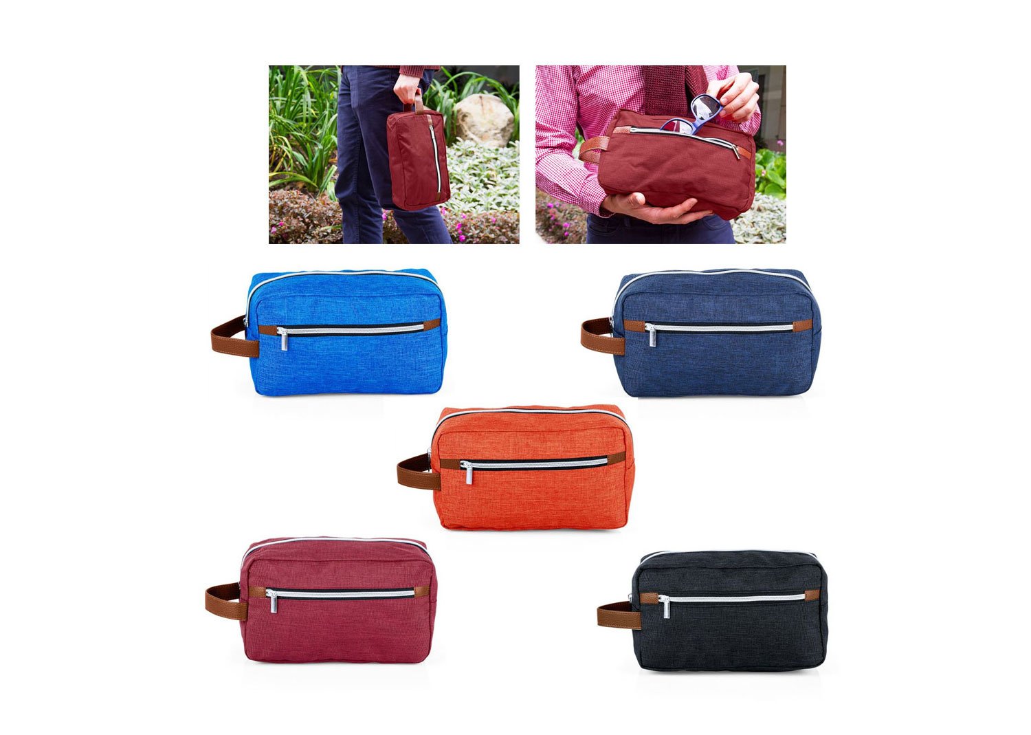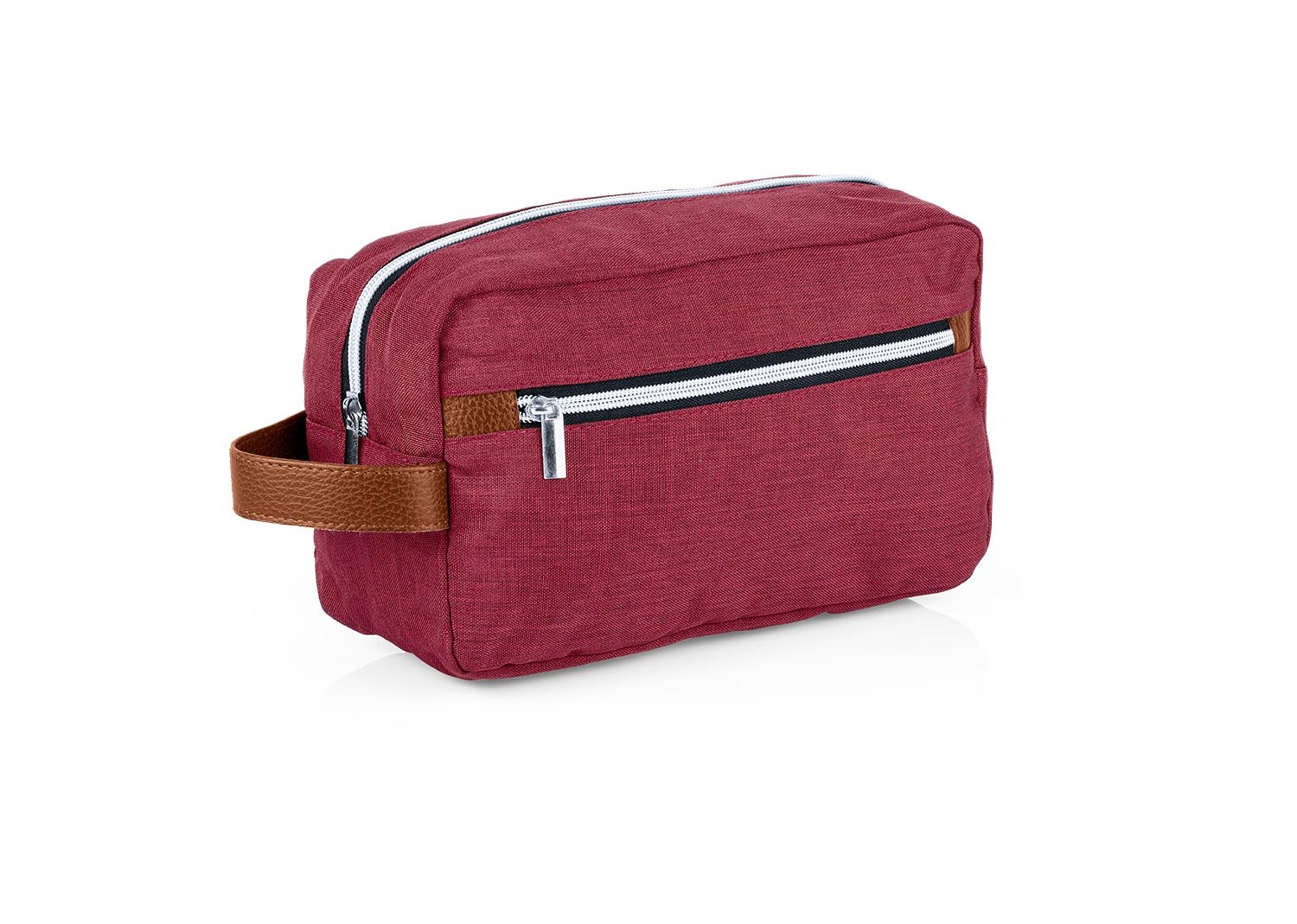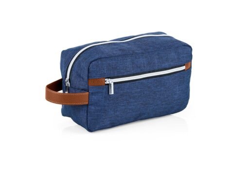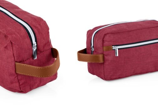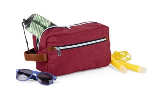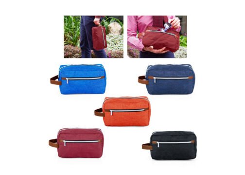 Estuche con manija imitación cuero, bolsillos principal y auxiliar con cierre de cremallera. Ideal para los productos de aseo personal y/o cosméticos.