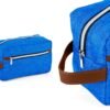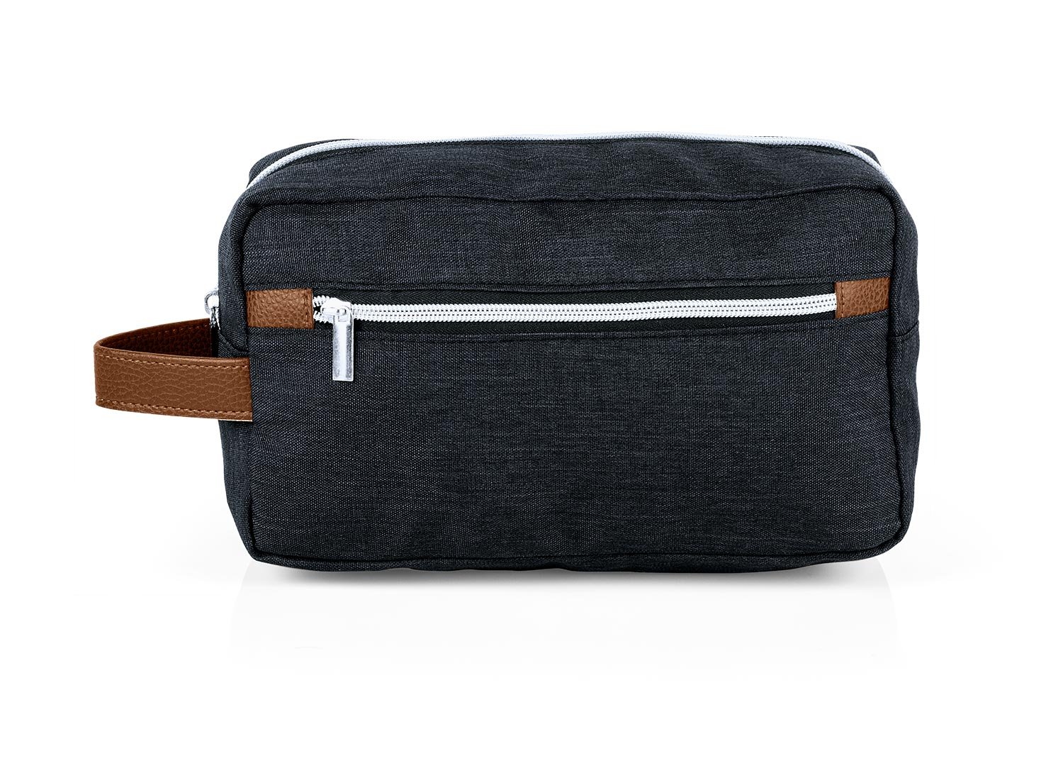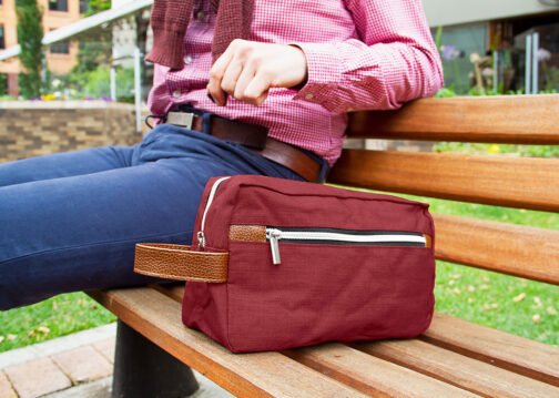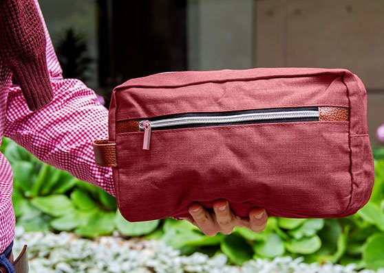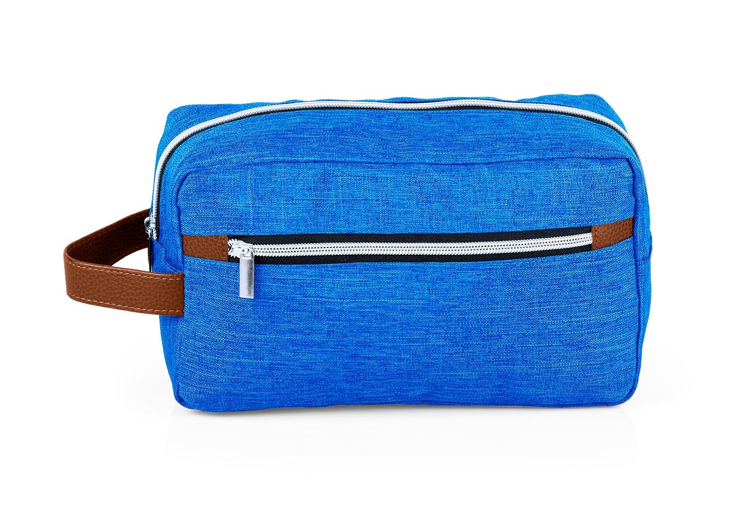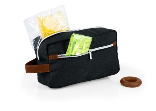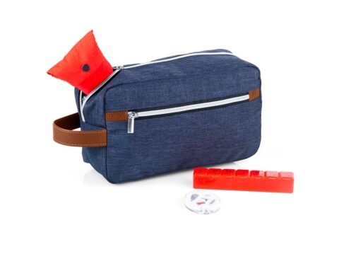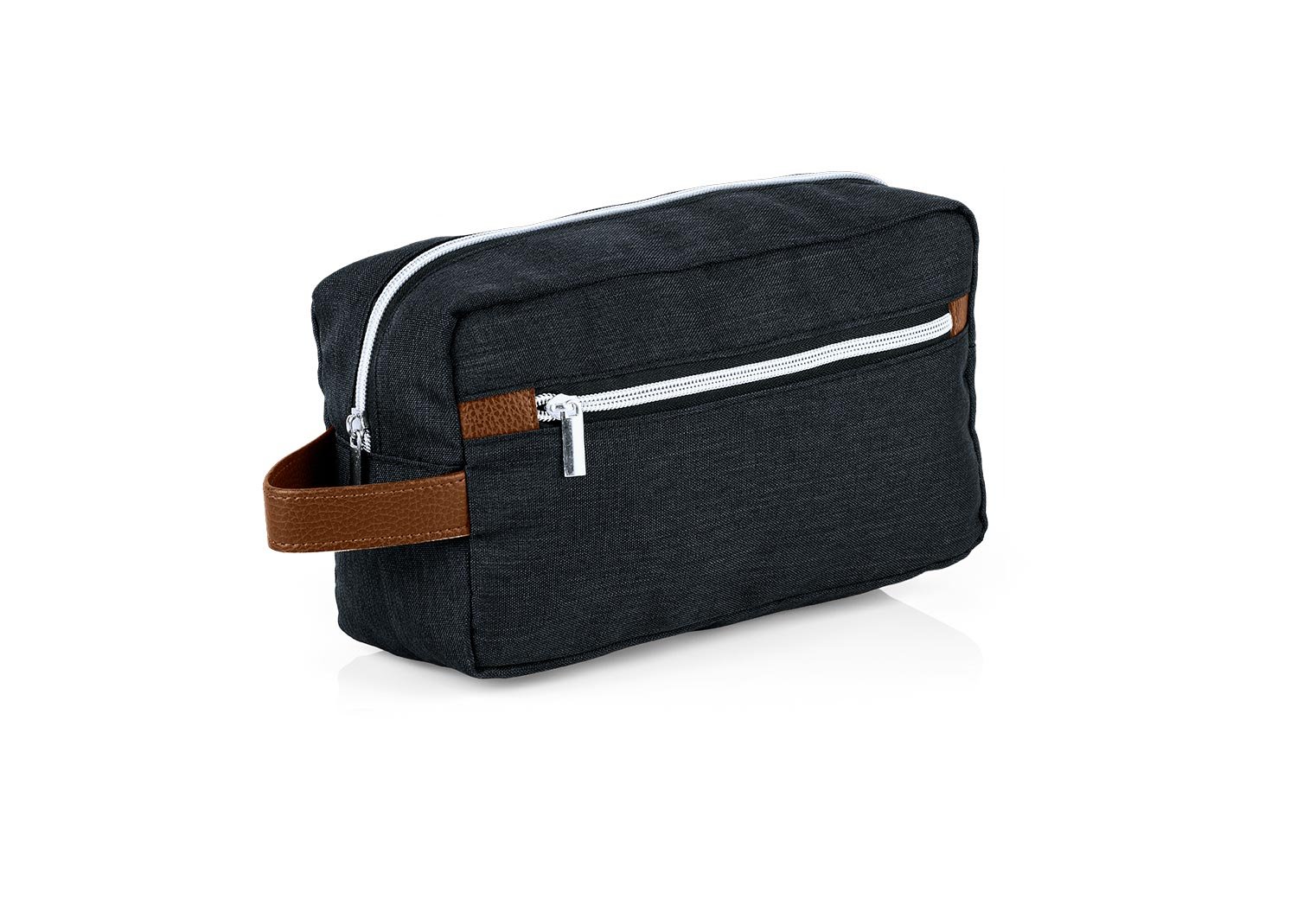 Estuche con manija imitación cuero, bolsillos principal y auxiliar con cierre de cremallera. Ideal para los productos de aseo personal y/o cosméticos.