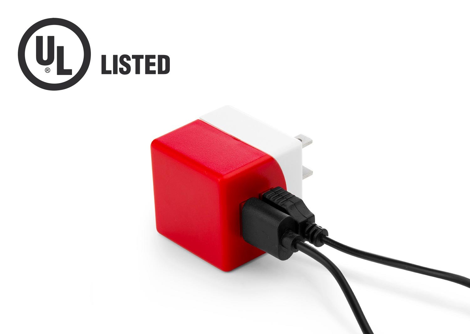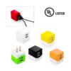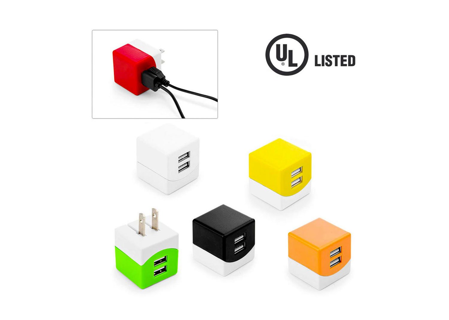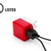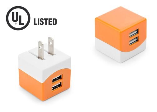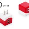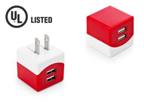 Cargador de pared con 2 puertos USB, entrada 100-240V – 50/60Hz 0,15A, salida 5V-1A. Cuenta con Certificado de Seguridad UL (E361273).
