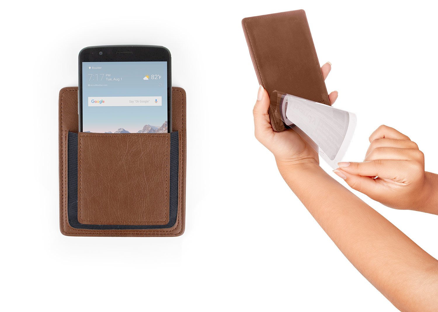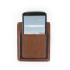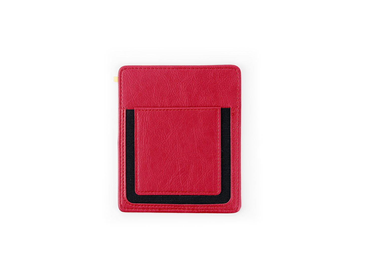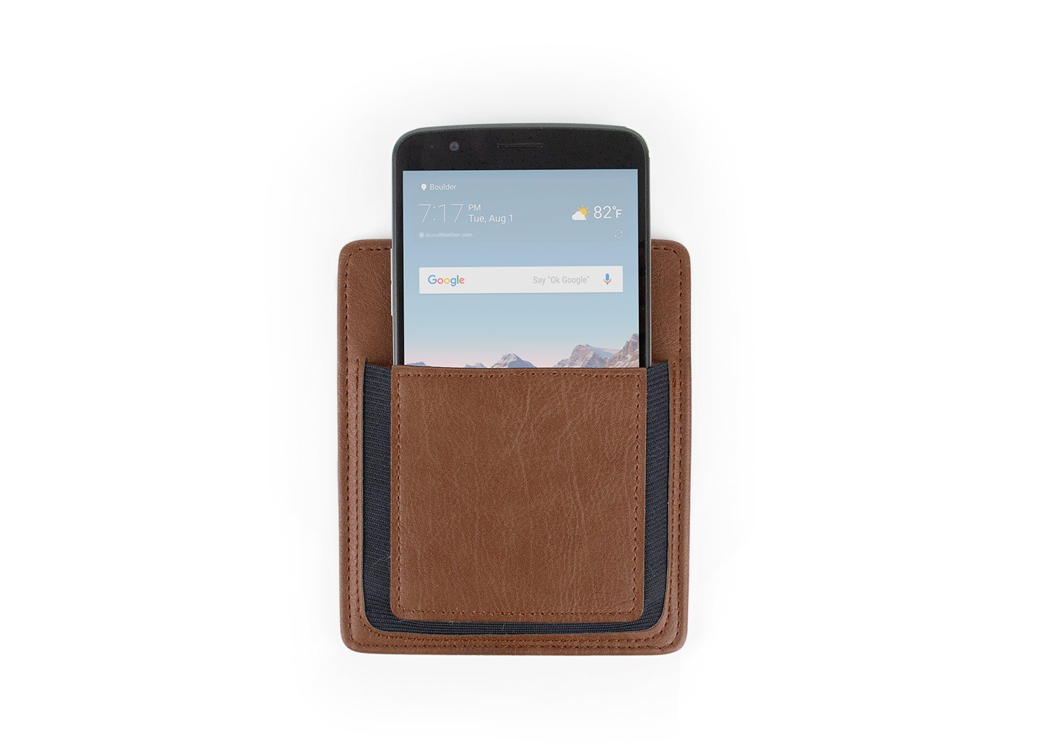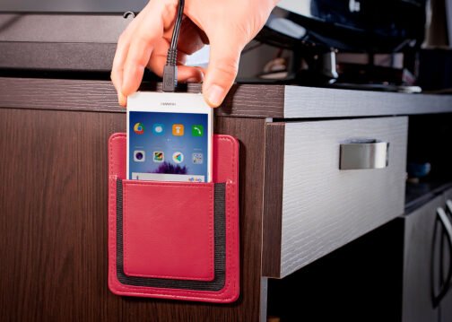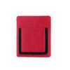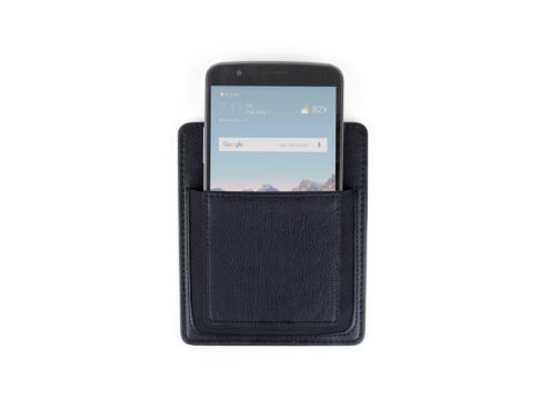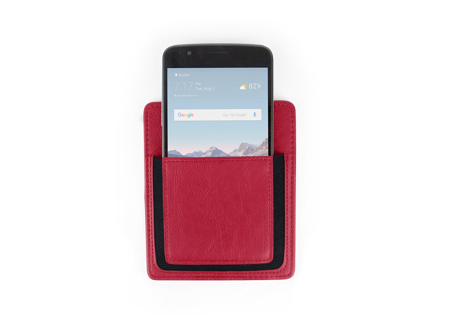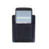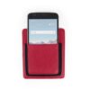 Bolsillo frontal para móvil con elástico lateral y lámina adhesiva posterior reutilizable.