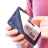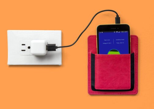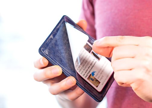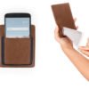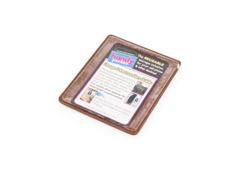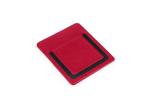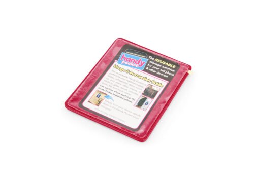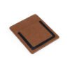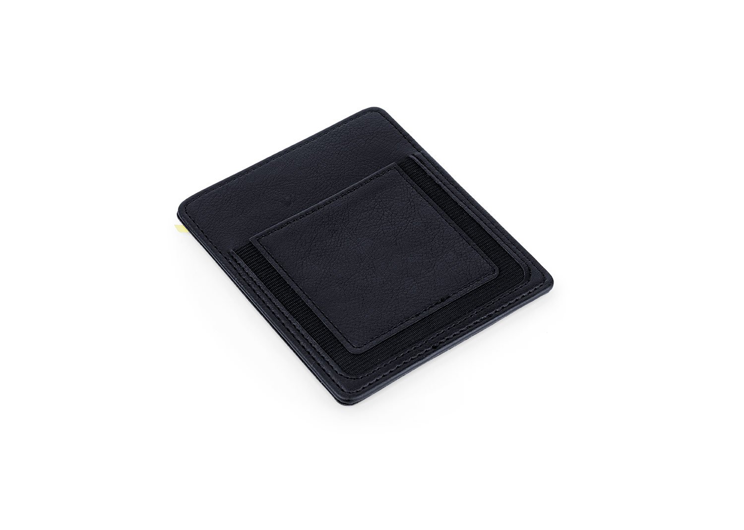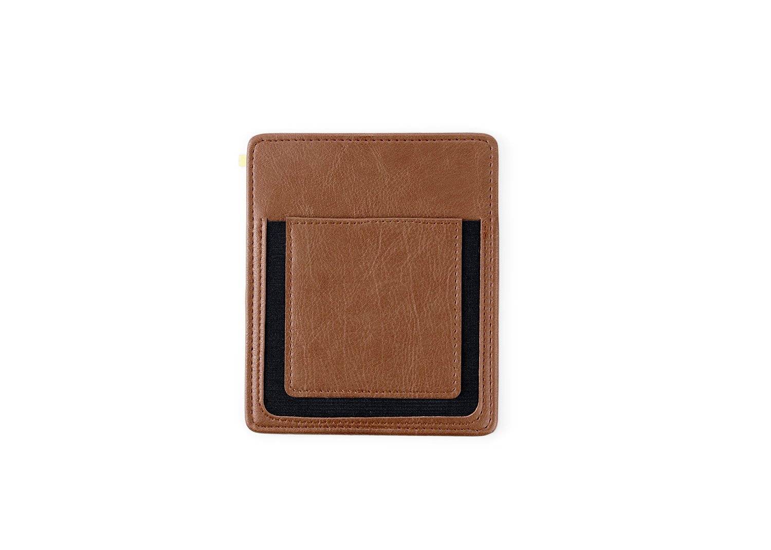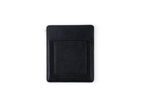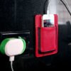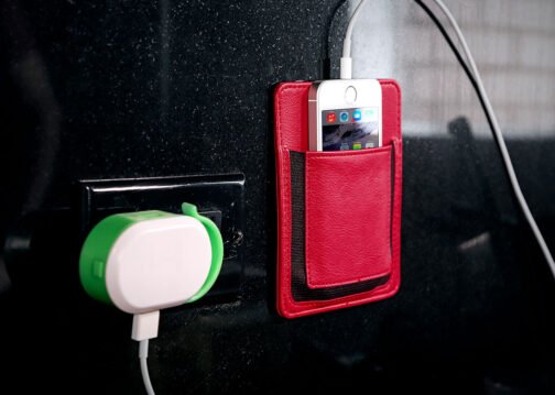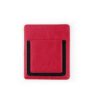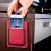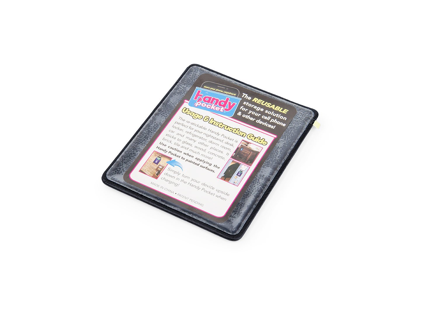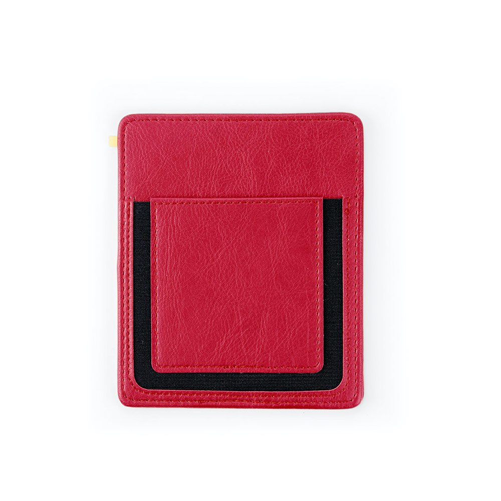 Bolsillo frontal para móvil con elástico lateral y lámina adhesiva posterior reutilizable.