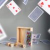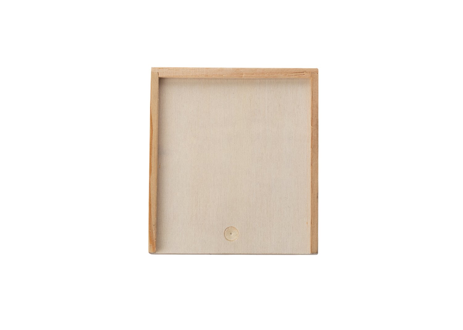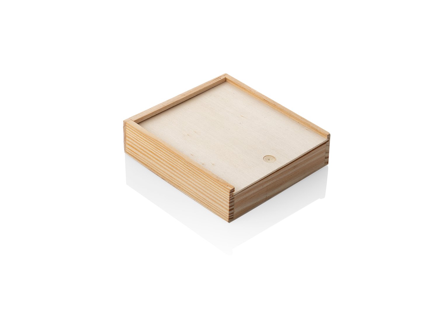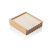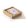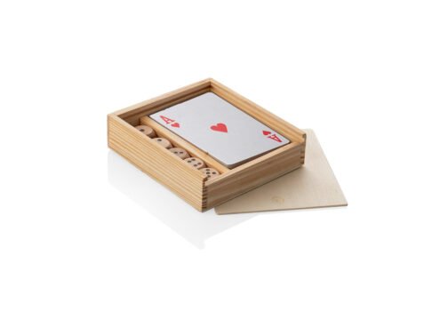 Estuche de madera con tapa deslizable que contiene un juego de cartas y 5 dados